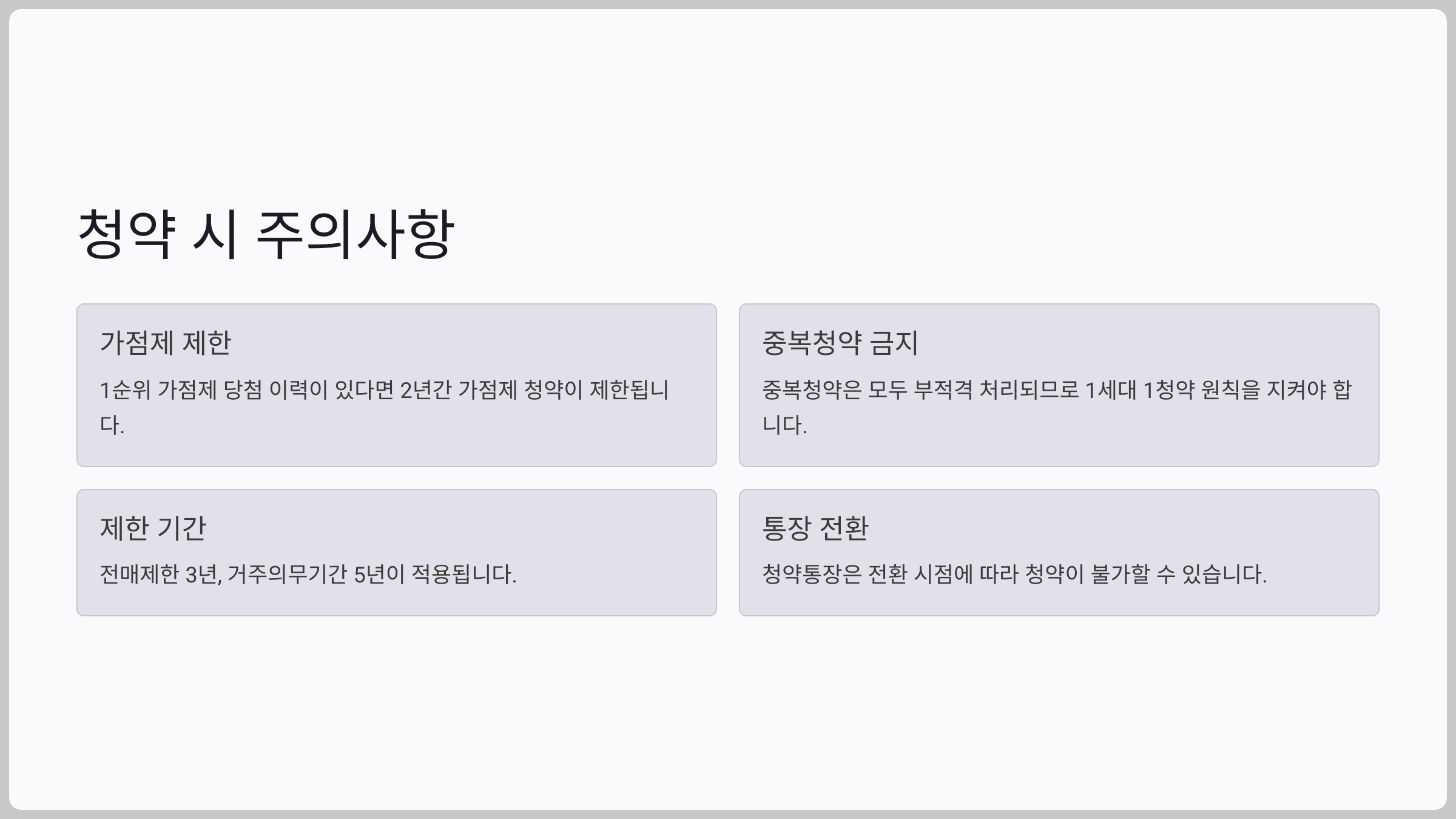 - 중복청약은 모두 부적격 처리되므로 1세대 1 청약 원칙을 지켜야 해요.