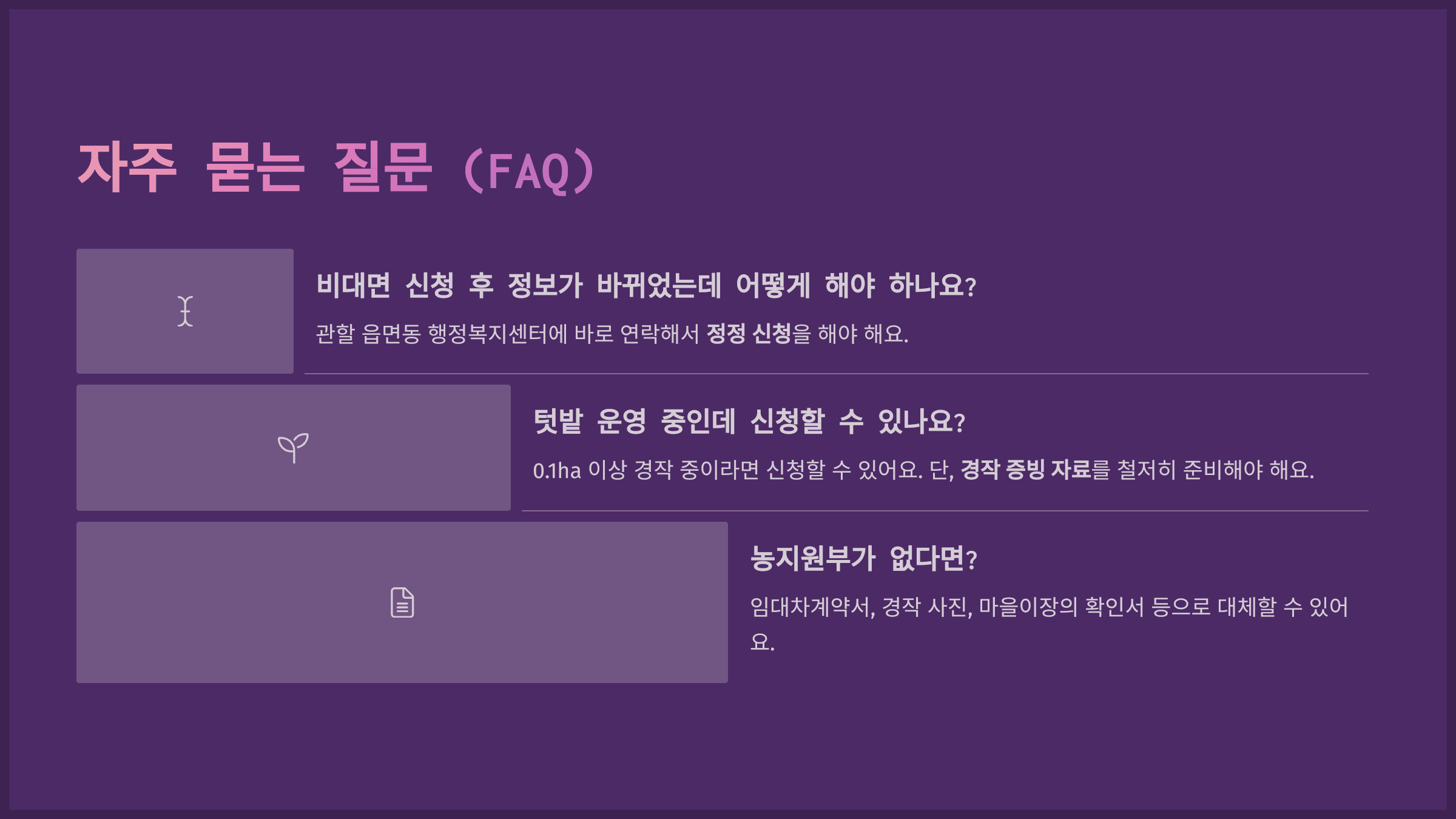 - 실제 경작 중임을 증명할 수 있어야 해요. (경작사실확인서, 농지대장 등)