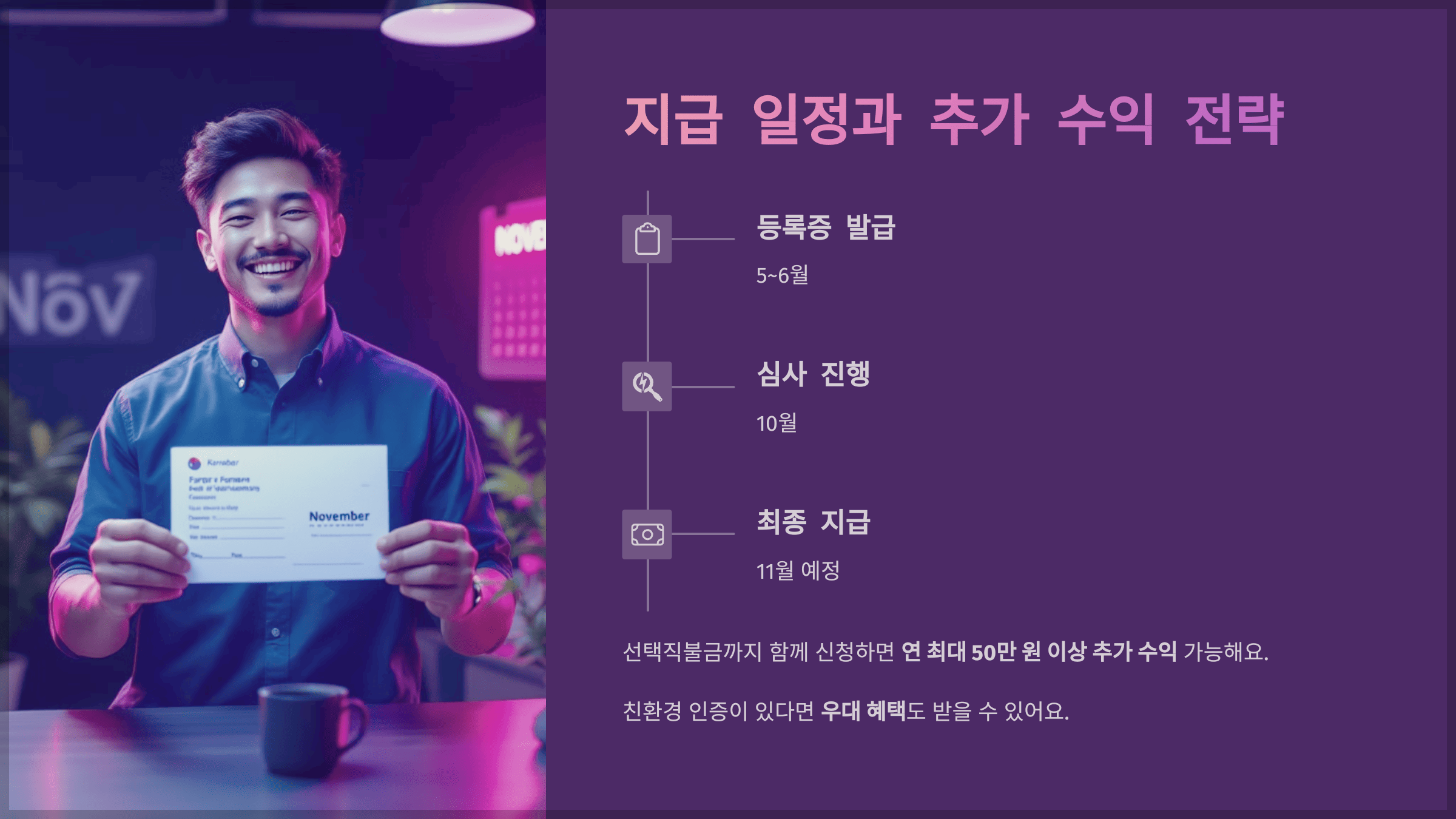 - 선택직불금까지 함께 신청하면 연 최대 50만 원 이상 추가 수익 가능해요.