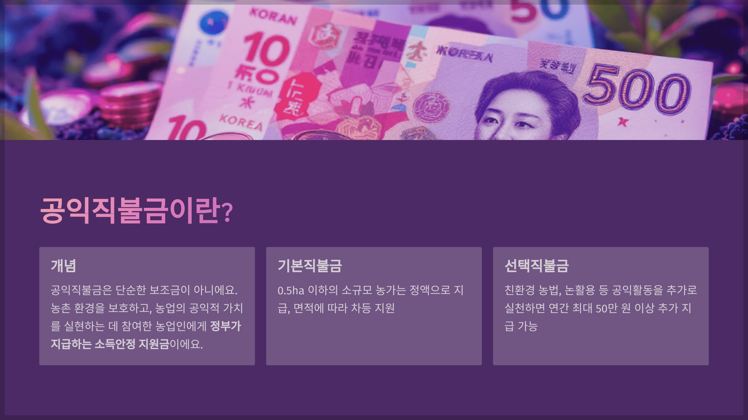 공익직불금은 단순한 보조금이 아니에요. 농촌 환경을 보호하고, 농업의 공익적 가치를 실현하는 데 참여한 농업인에게