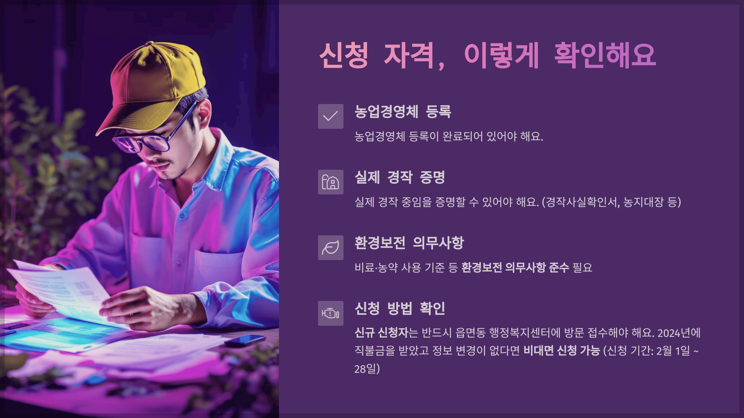 공익직불금은 누구나 받을 수 있는 건 아니에요. 자격 조건을 하나씩 체크하면서 준비해 보세요.