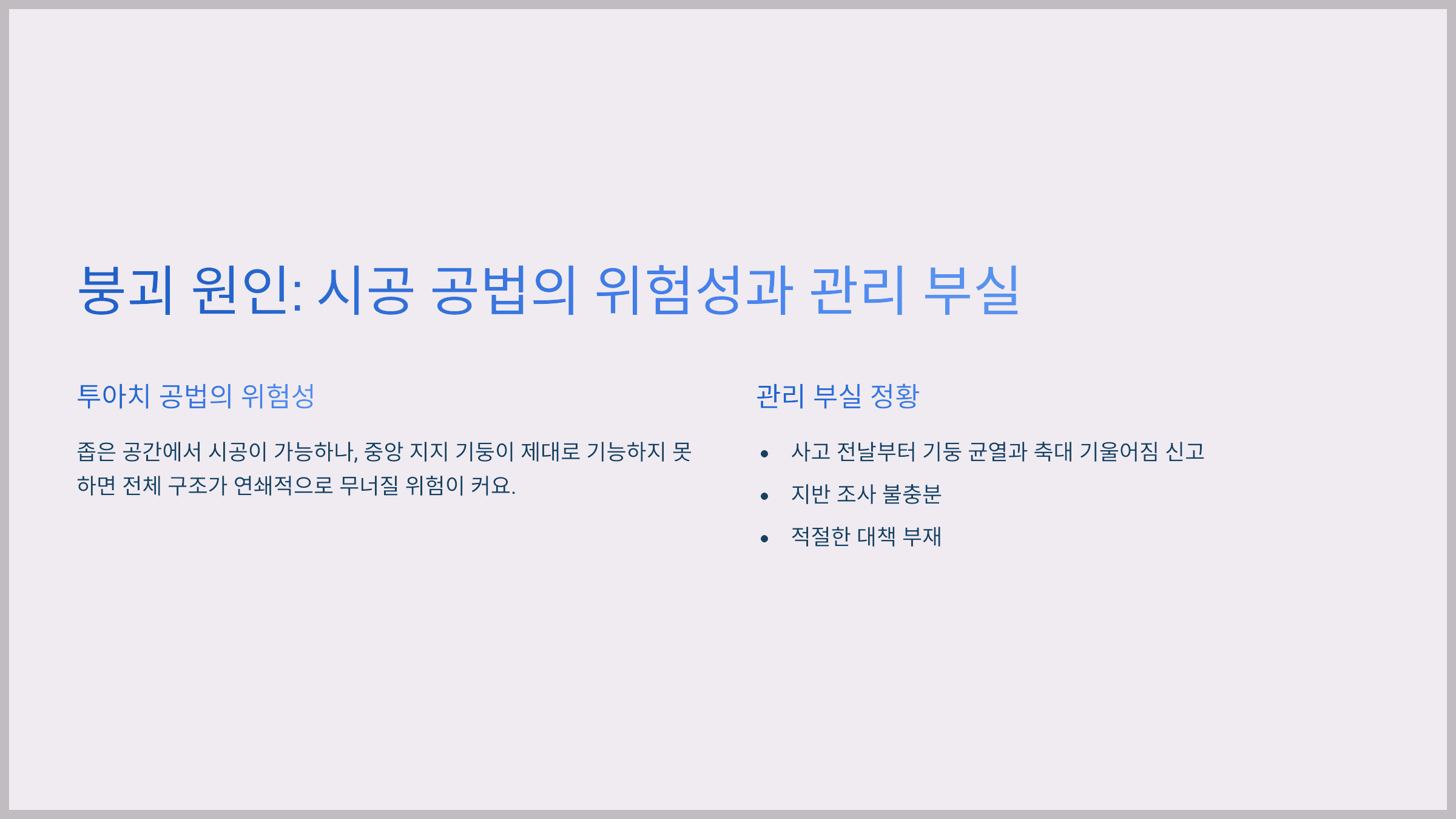 ⚠️ 붕괴 원인: 시공 공법의 위험성과 관리 부실