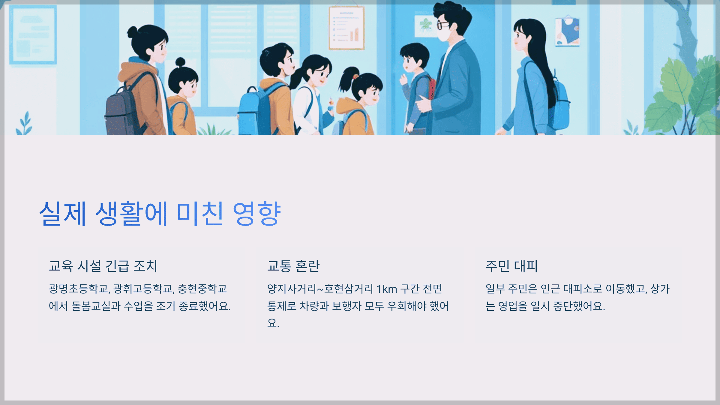 - 학생들은 사고 직전에 대부분 귀가해 다행히 큰 인명피해는 없었음