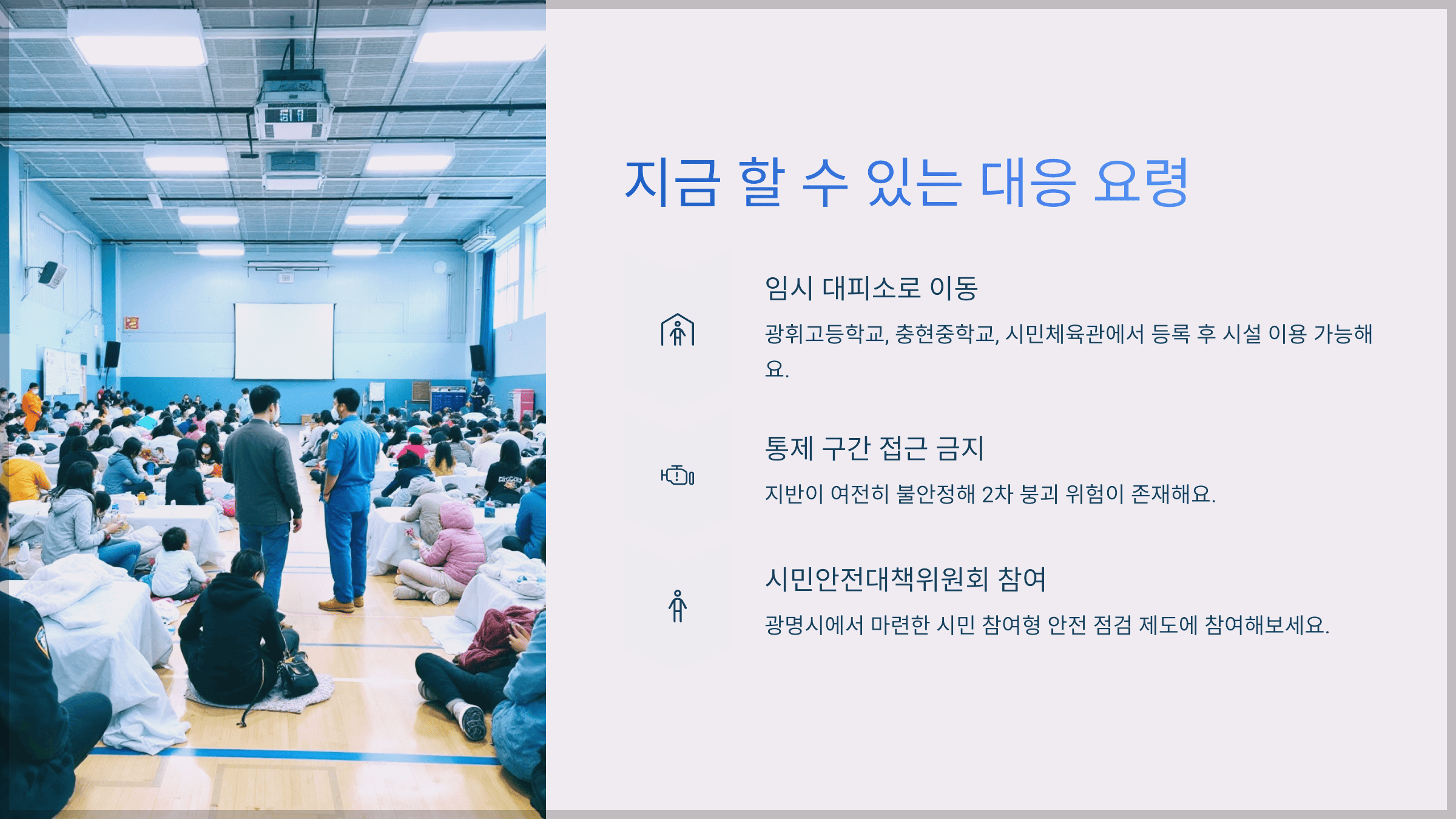 - 활용 가능한 주요 대피소: 광휘고등학교, 충현중학교, 시민체육관