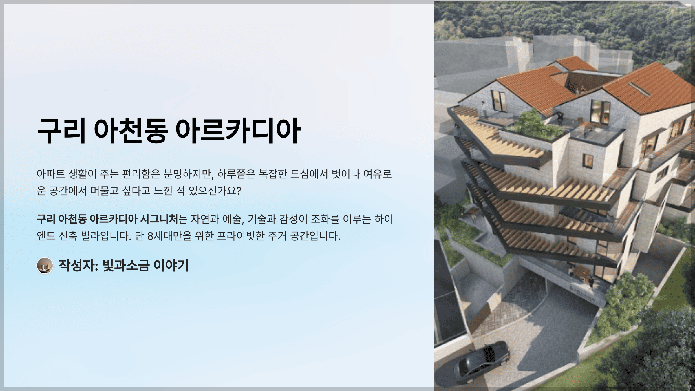 이제 그 바람을 현실로 만들 수 있는 곳이 있습니다. 구리 아천동 아르카디아 시그니처는 자연과 예술, 기술과 감성이 조화를 이루는 하이엔드 신축 빌라로, 단 8세대 만을 위한 프라이빗한 주거 공간입니다.