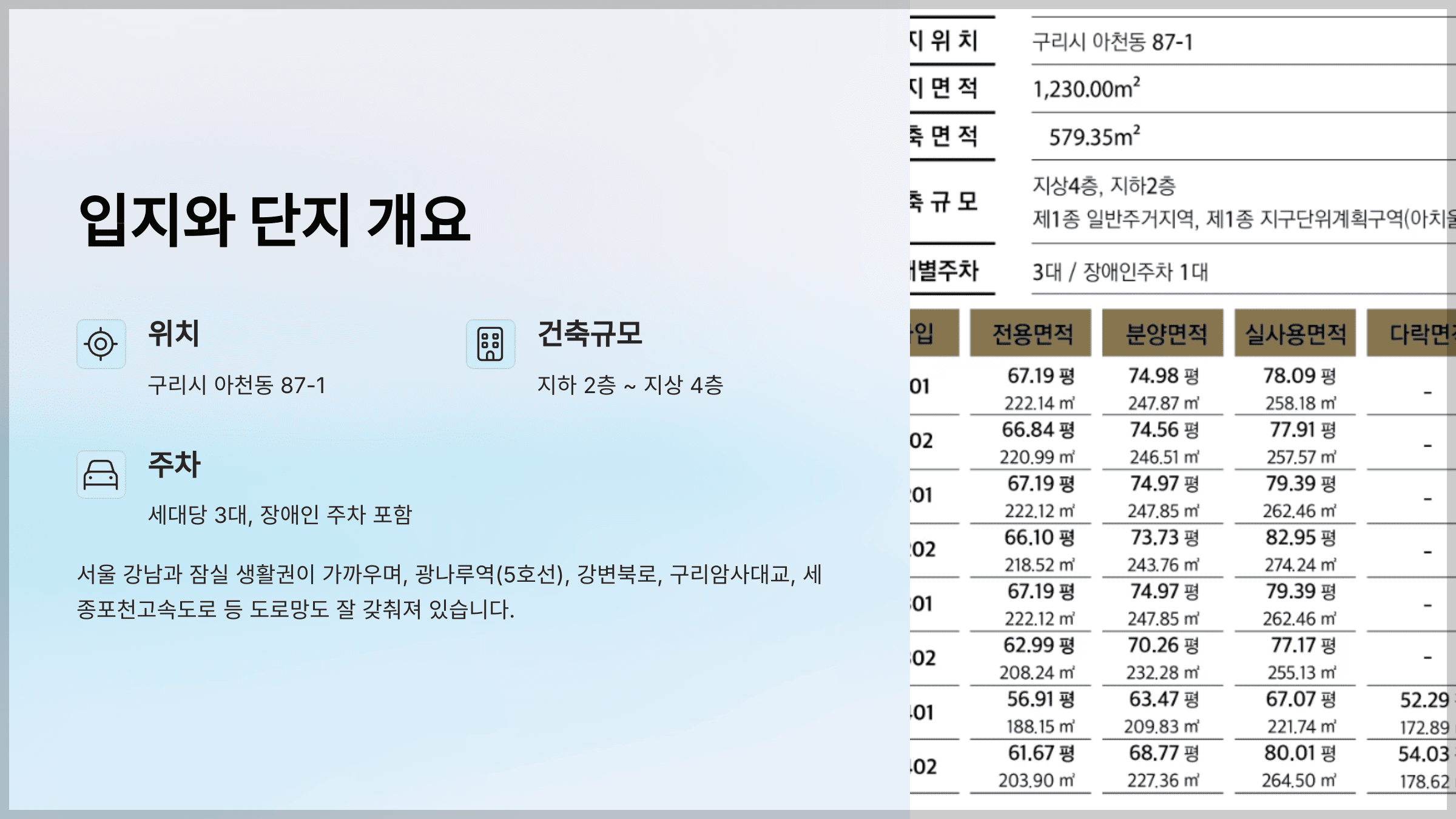 서울 강남과 잠실 생활권이 가까우며, 광나루역(5호선), 강변북로, 구리암사대교, 세종포천고속도로 등 도로망도 잘 갖춰져 있어 출퇴근이나 외출이 편리합니다.