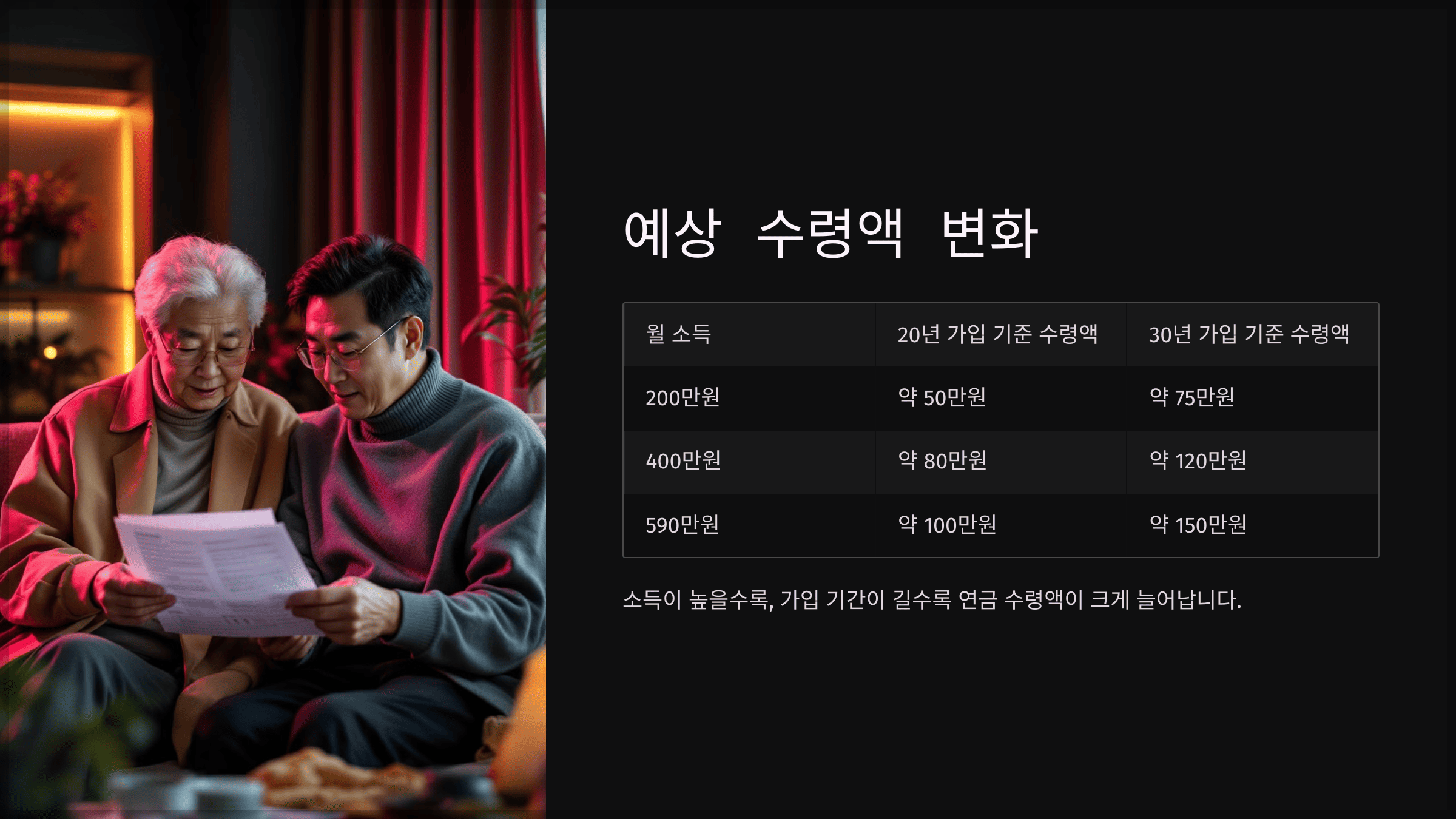 연금 수령액은 가입 기간, 소득 수준에 따라 달라진다. 이번 개혁안을 통해 실제로 얼마나 수령액이 증가할지 구체적으로 살펴보자.