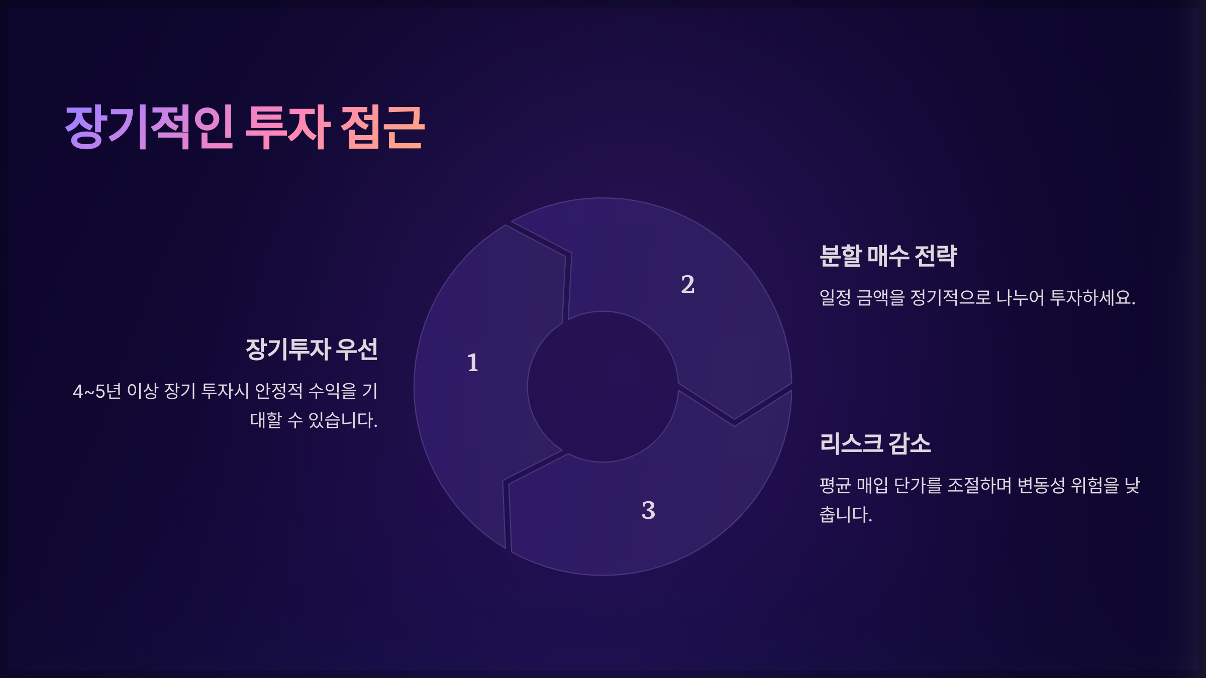✔ 장기적인 투자 계획을 세우고 분할 매수 전략 적용