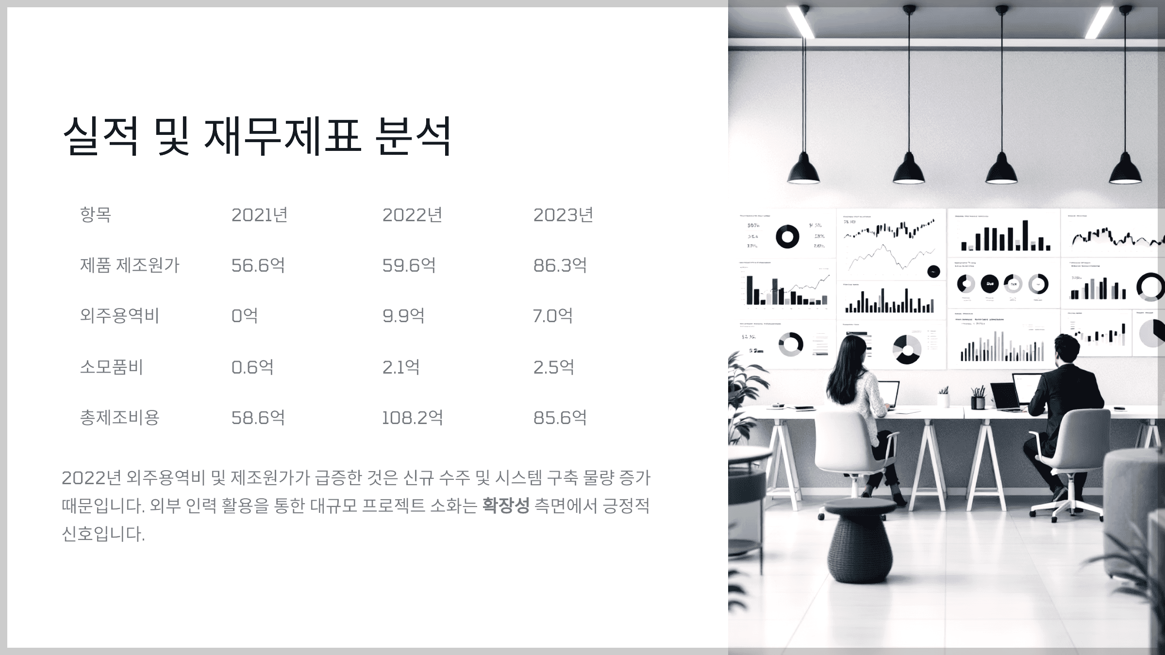 2022년 외주용역비 및 제조원가가 급증한 것은 신규 수주 및 시스템 구축 물량 증가 때문으로 분석됩니다. 특히 외부 인력 활용을 통해 대규모 프로젝트를 소화했다는 점은 확장성 측면에서 긍정적 신호로 볼 수 있습니다.