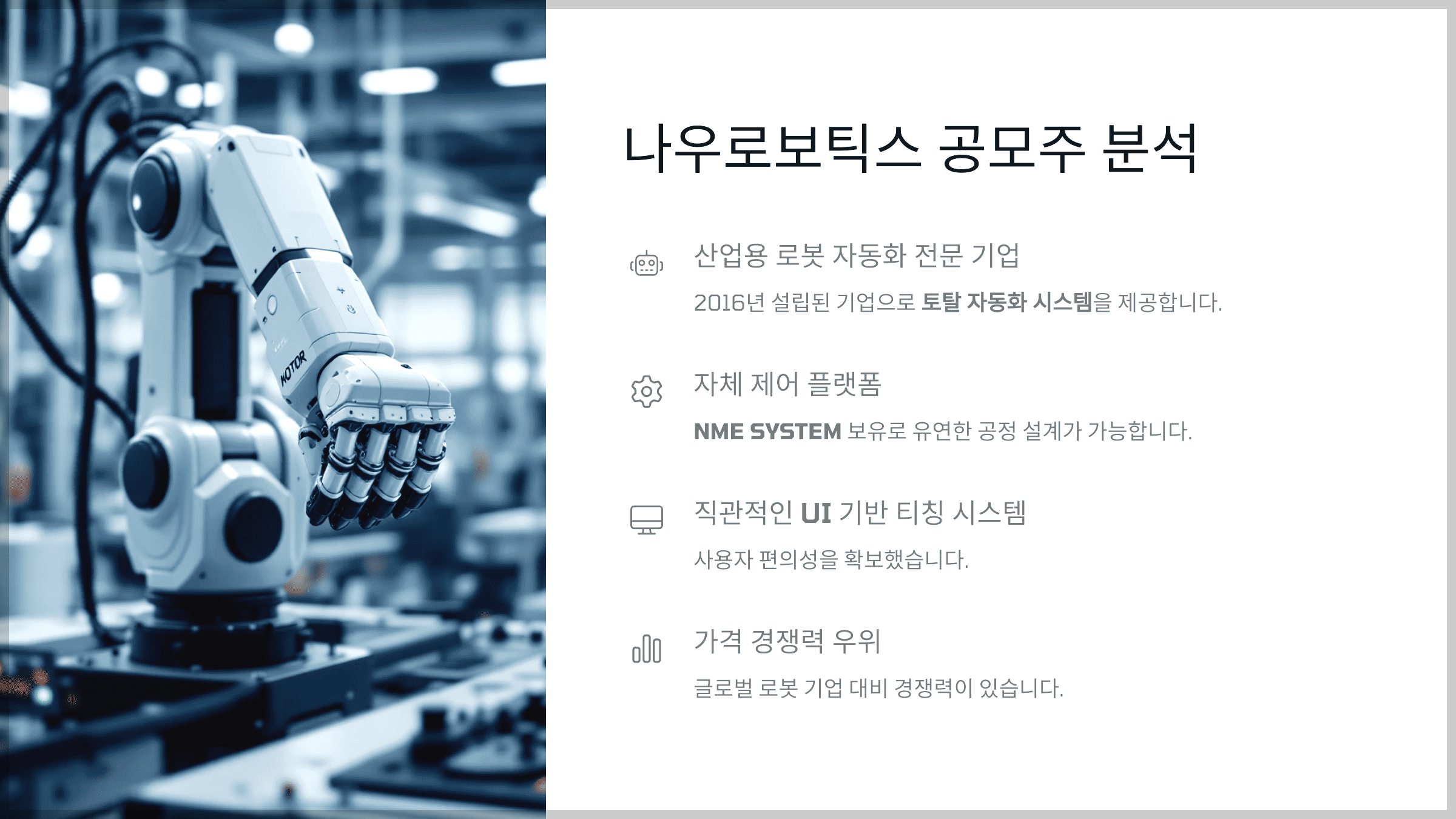 나우로보틱스는 기술 중심의 로봇 기업으로, 앞으로의 제조업 자동화 시대를 선도할 잠재력이 충분한 기업입니다.
