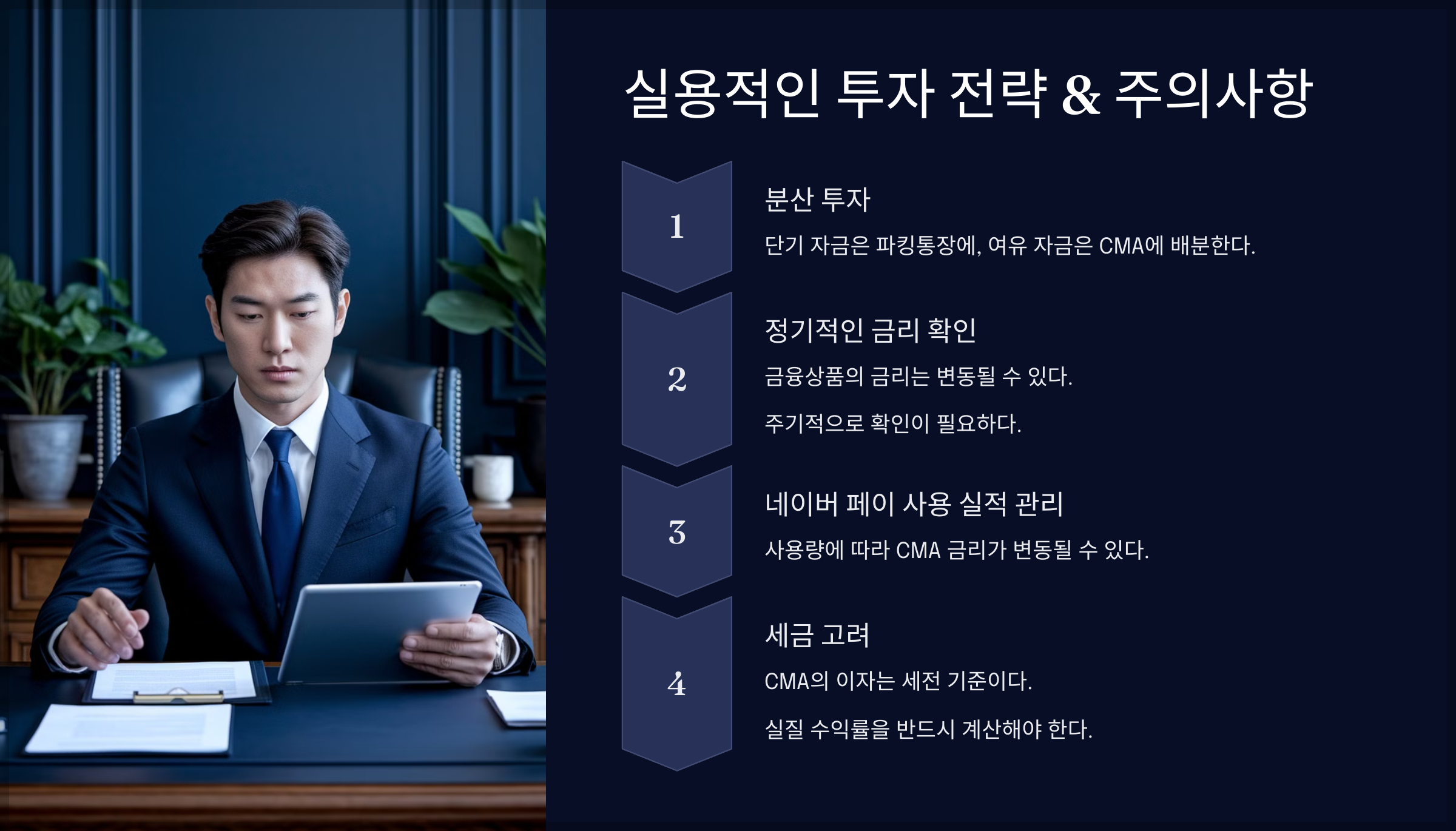 ✔ 세금 고려: CMA의 이자는 세전 기준이므로 실질 수익률을 반드시 계산해야 함