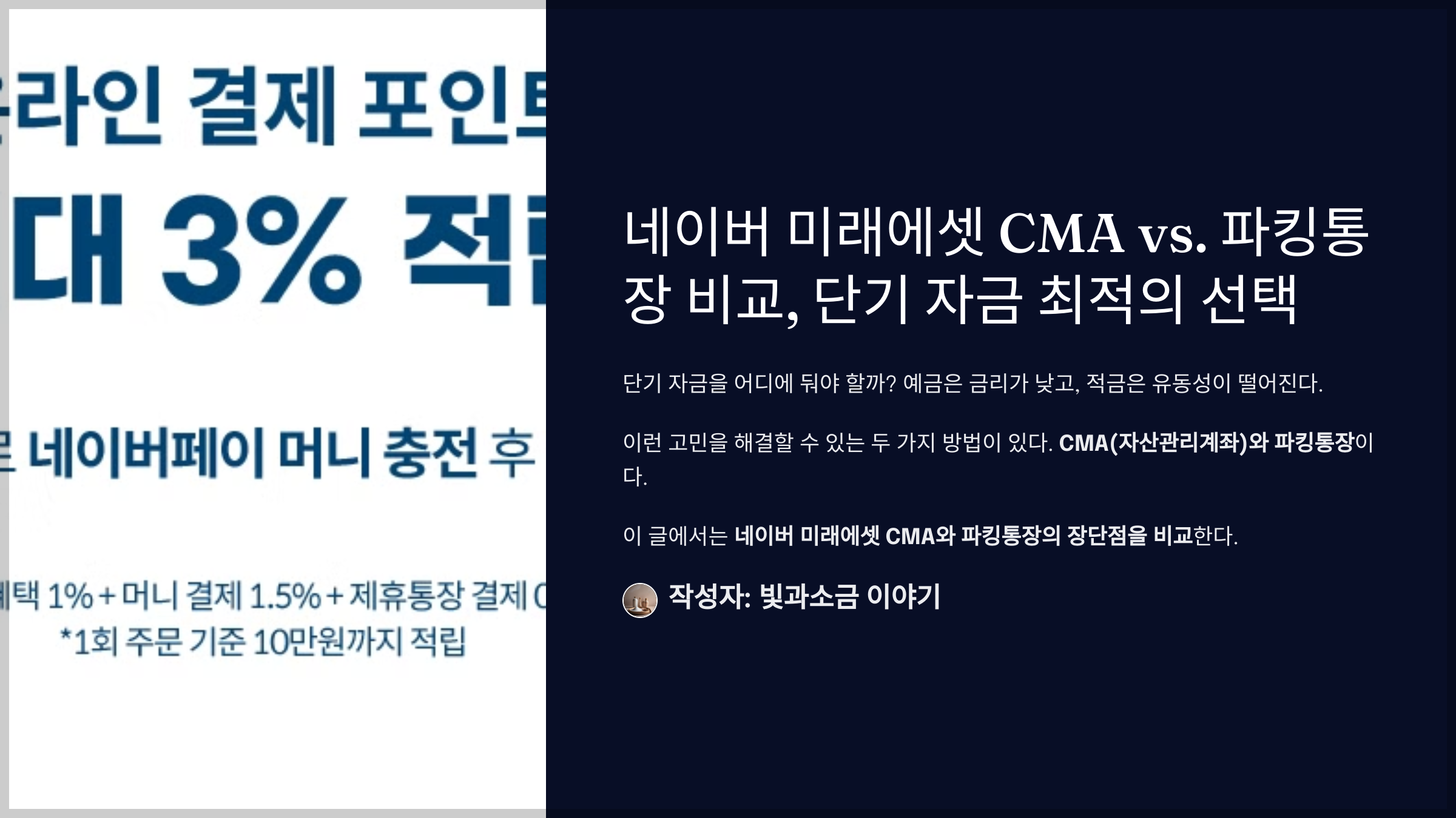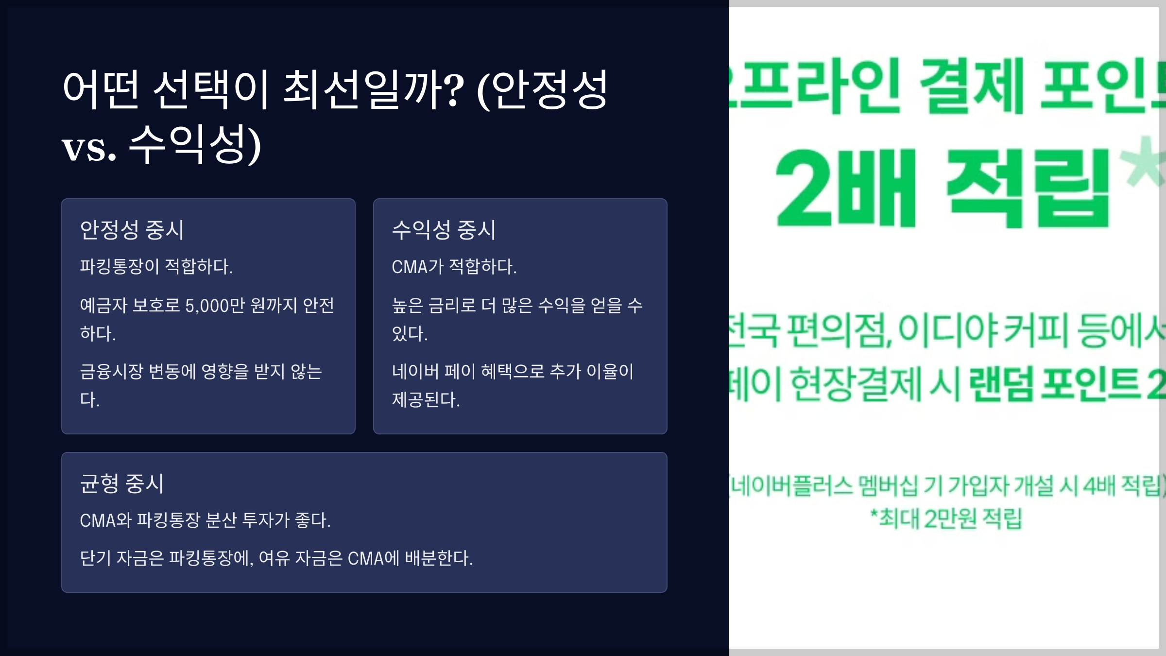 ✔ 두 가지를 균형 있게 고려한다면 → CMA와 파킹통장 분산 투자