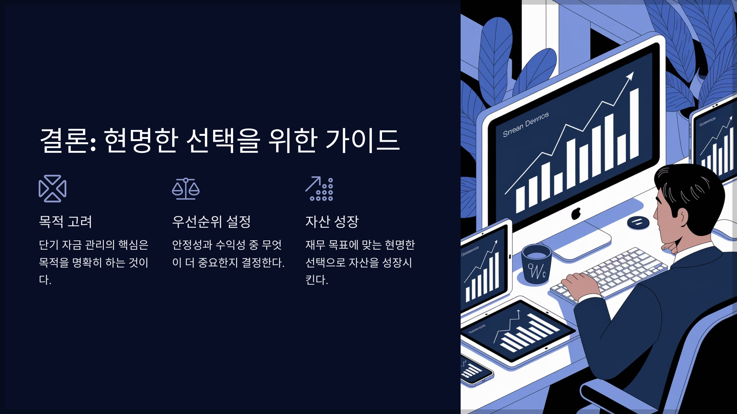 💰 단기 자금 관리의 핵심은 '목적'과 '우선순위'를 고려하는 것이다. 📢 재무 목표에 맞는 현명한 선택으로 자산을 안전하게 성장시키자! 🚀 좋은 상품을 지속적으로 찾아보는 노력이 조금씩 자신의 부를 축척하는 지름길이 될 수 있다.