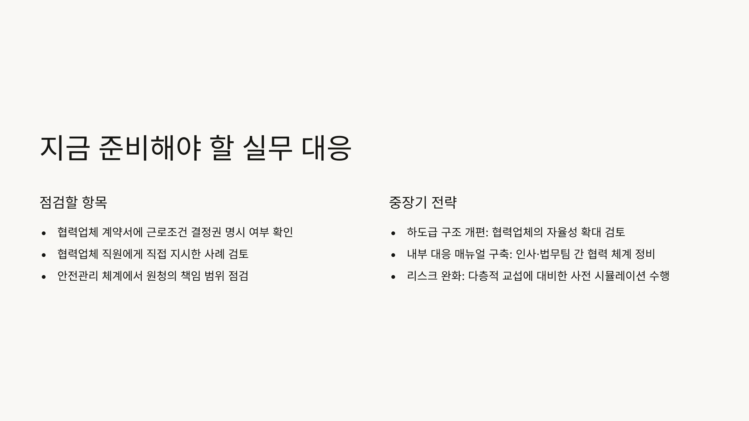 지금까지 노란봉투법, 사용자 범위, 하청 근로자 원청과 교섭, 파업 배상책임을 알아봤습니다. 노란봉투법은 단순한 법률 변경이 아니라, 노사관계 전반의 구조적 재편입니다.