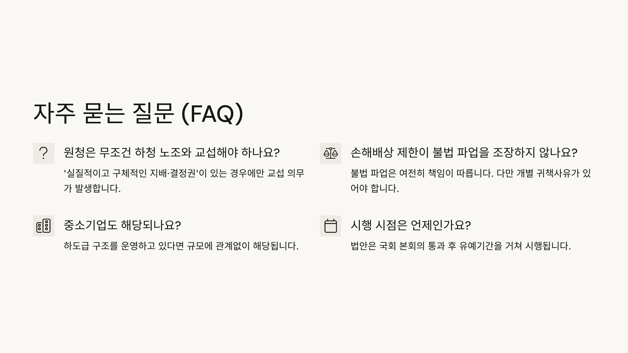 특히 하도급 구조나 플랫폼 근로자와 같이 복잡한 고용관계가 보편화된 현실에서, 이 법안은 노동자와 기업 모두에게 중요한 의미를 지닙니다. 현장에서 인사나 노무를 관리하고 계시다면, 이 변화가 어떤 영향을 미칠지 정확하게 파악하고 대응 전략을 마련하는 것이 매우 중요합니다.