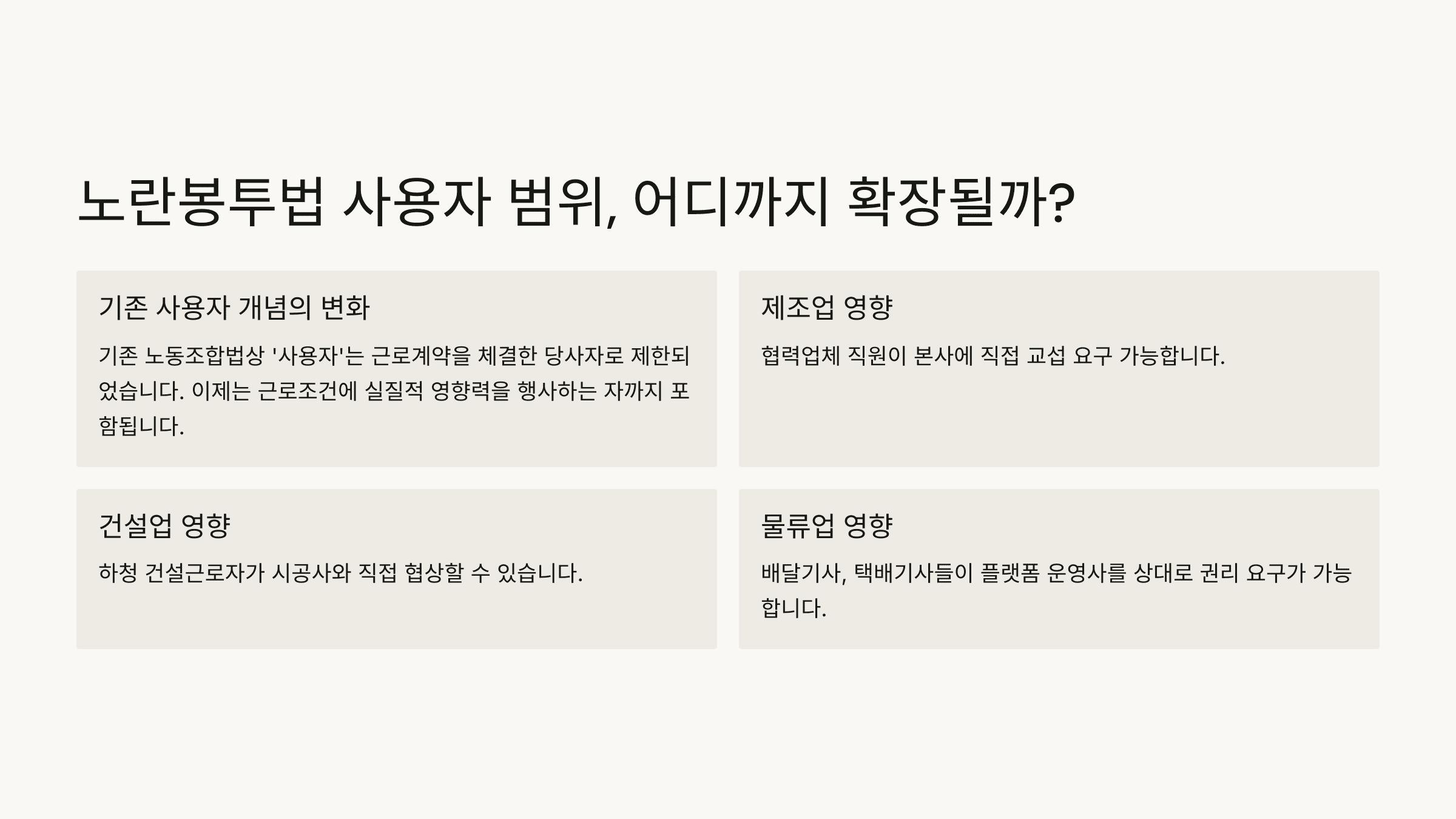 - 건설업: 하청 건설근로자가 시공사와 직접 협상 가능