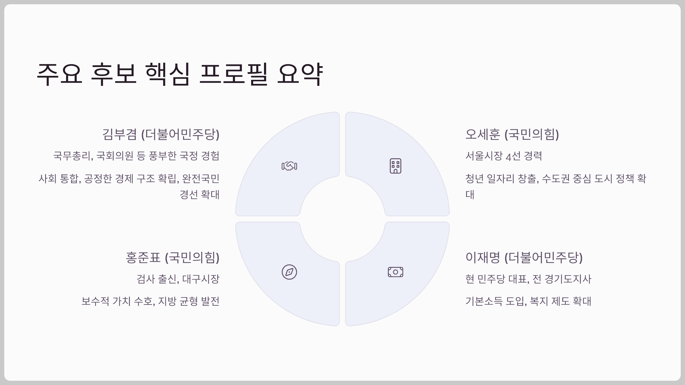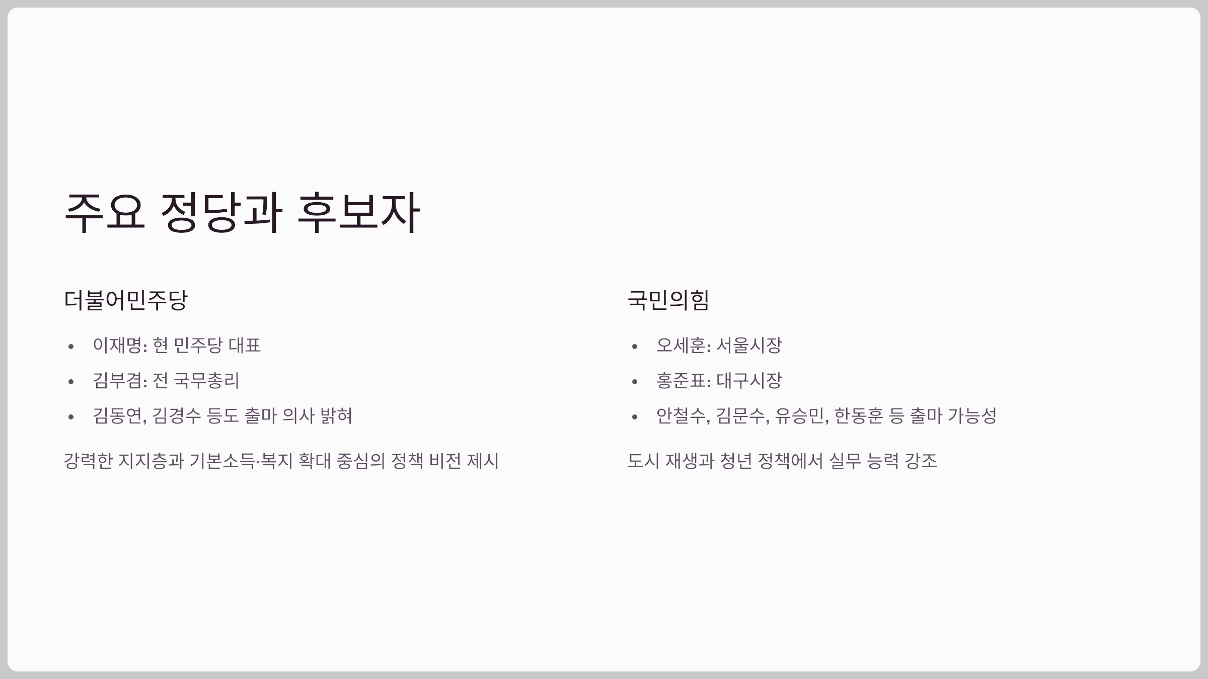 짧은 선거운동 기간, 수많은 공약, 다양한 후보들 사이에서 어떤 기준으로 선택해야 할지 막막할 수 있다. 이 글에서는 주요 정당과 후보자들을 정리하고, 핵심 정책과 차별점을 비교해 볼 수 있도록 구성했다. 조금 더 빠르고 정확하게 상황을 파악하고 싶다면, 지금부터 차근히 살펴보자.
