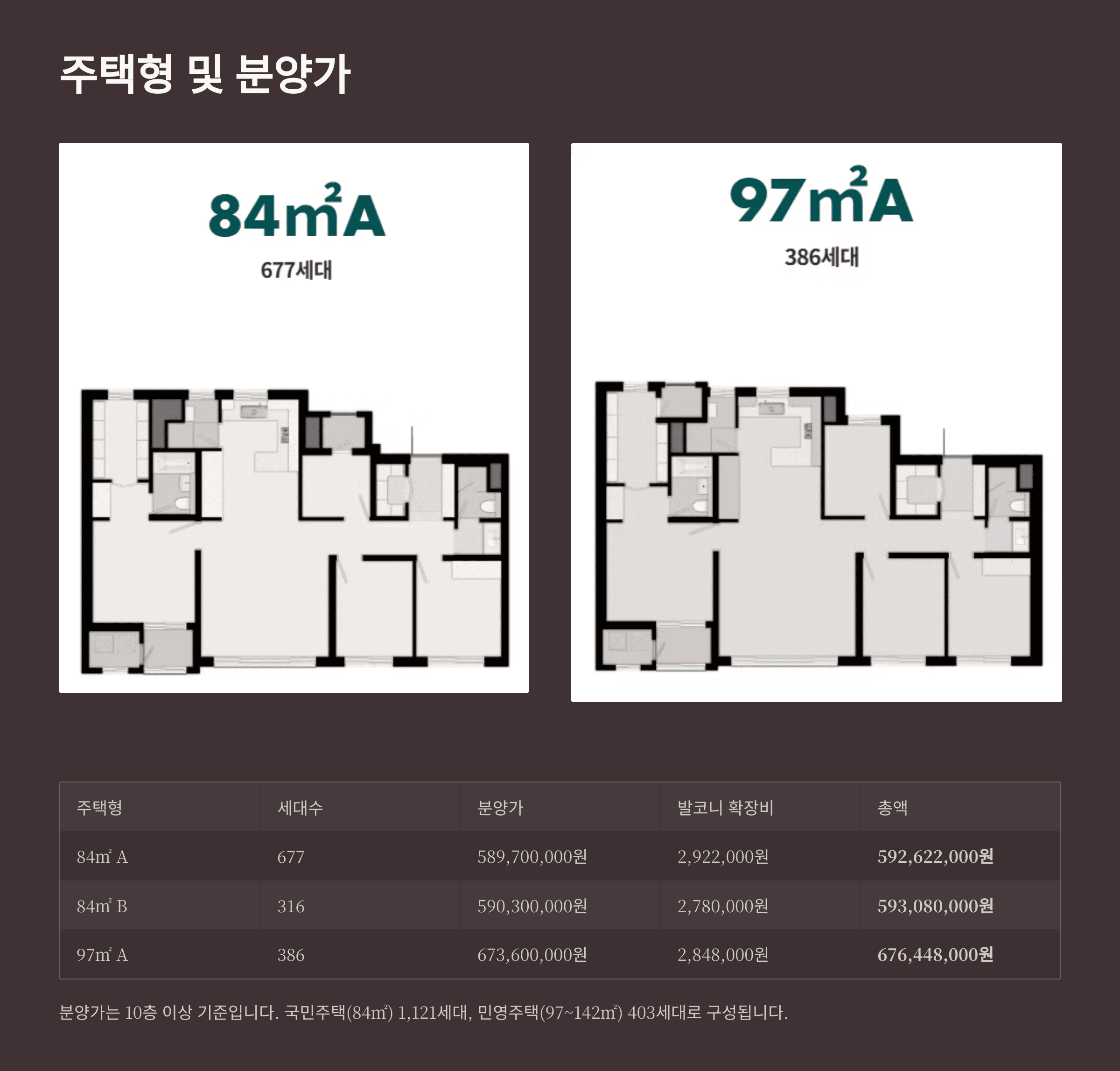 | 84㎡ A | 677 | 589,700,000원 | 2,922,000원 | 592,622,000원 |