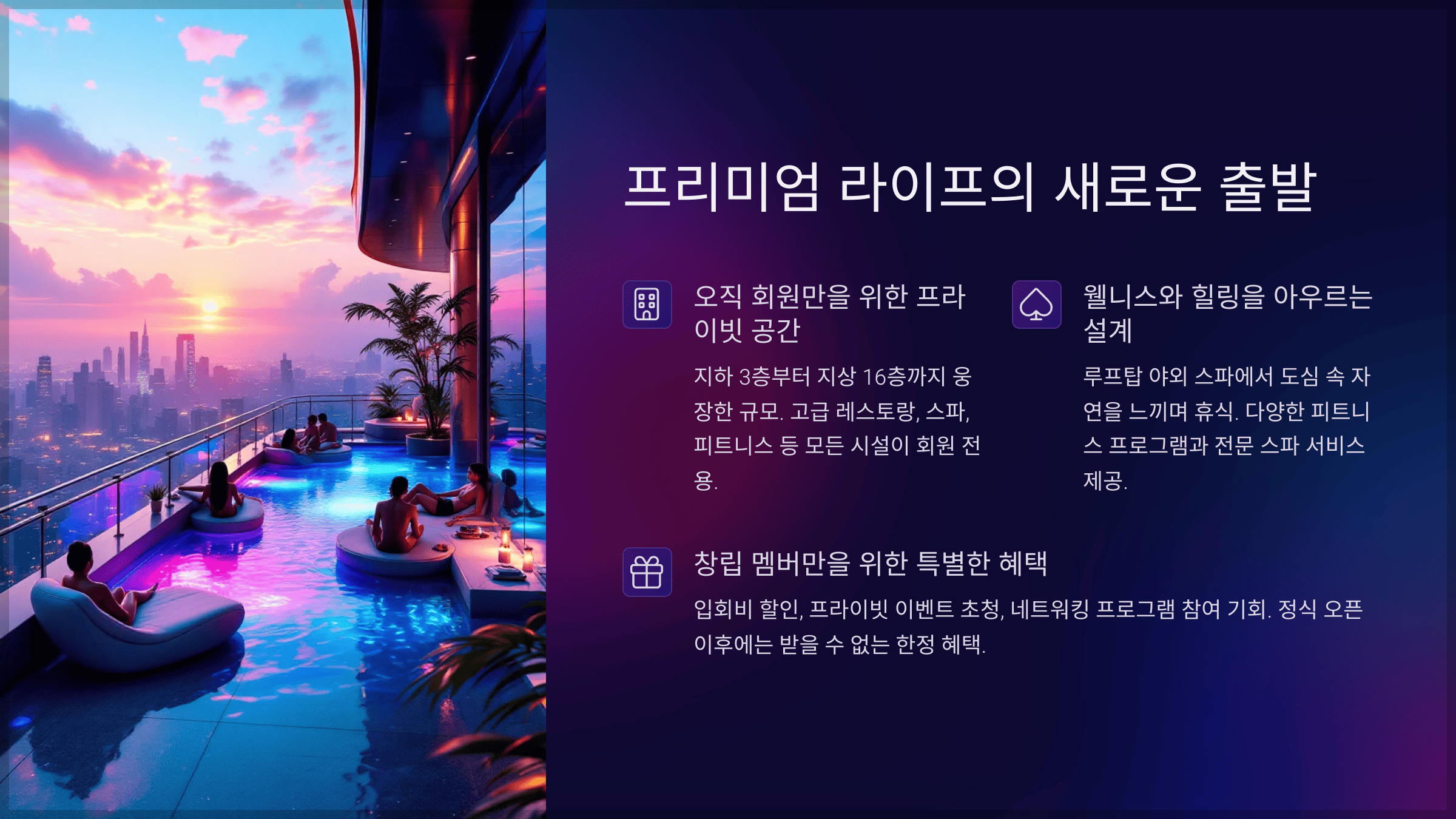 대한민국 최초 하이엔드 멤버십 클럽으로, 한 차원 높은 라이프스타일을 누릴 수 있는 곳입니다.