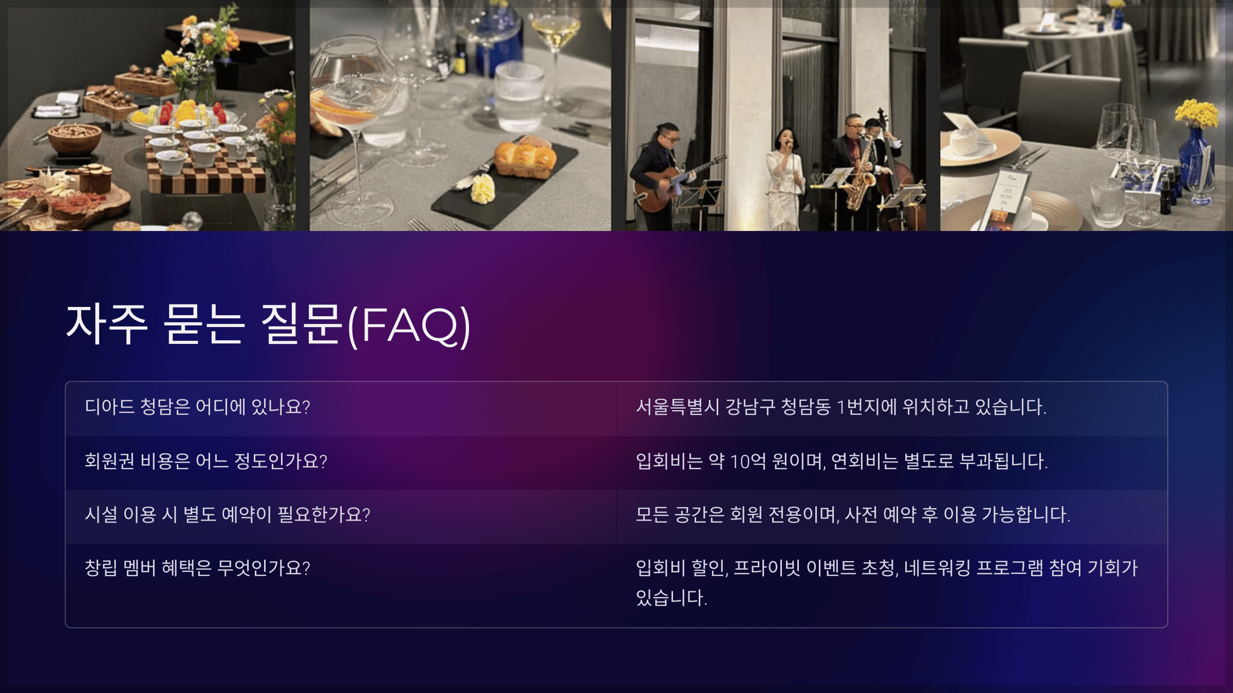 디아드 청담 멤버십 클럽은 단순한 고급 공간을 넘어, 삶의 품격을 한 단계 끌어올려주는 특별한 경험을 선사합니다.