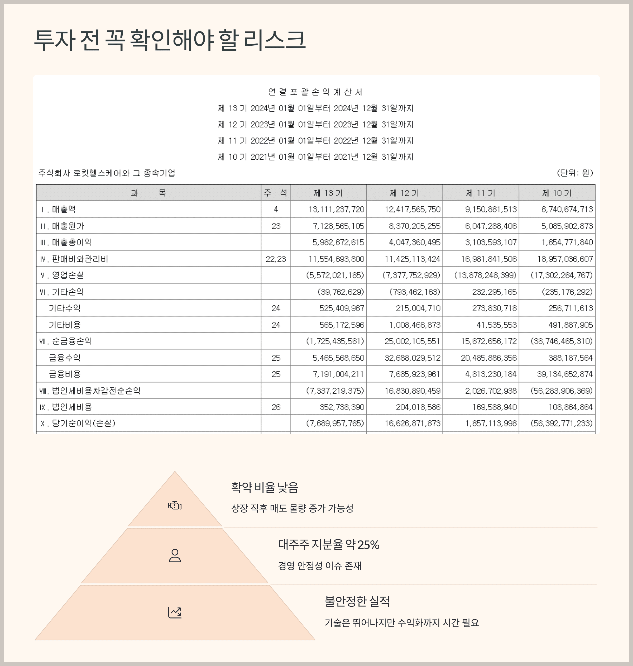 로킷헬스케어는 기술 기반 바이오 기업으로 미래 성장성이 매우 높은 종목입니다. 하지만 낮은 의무보유 확약 비율, 대주주 지분구조, 불확실한 수익성 등 리스크도 존재하니 단기와 장기 전략 모두 신중하게 접근하셔야 합니다.
