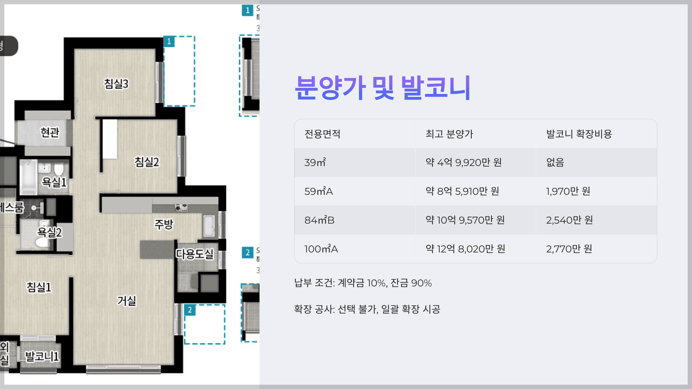 | 전용면적 | 최고 분양가 | 발코니 확장비용 |