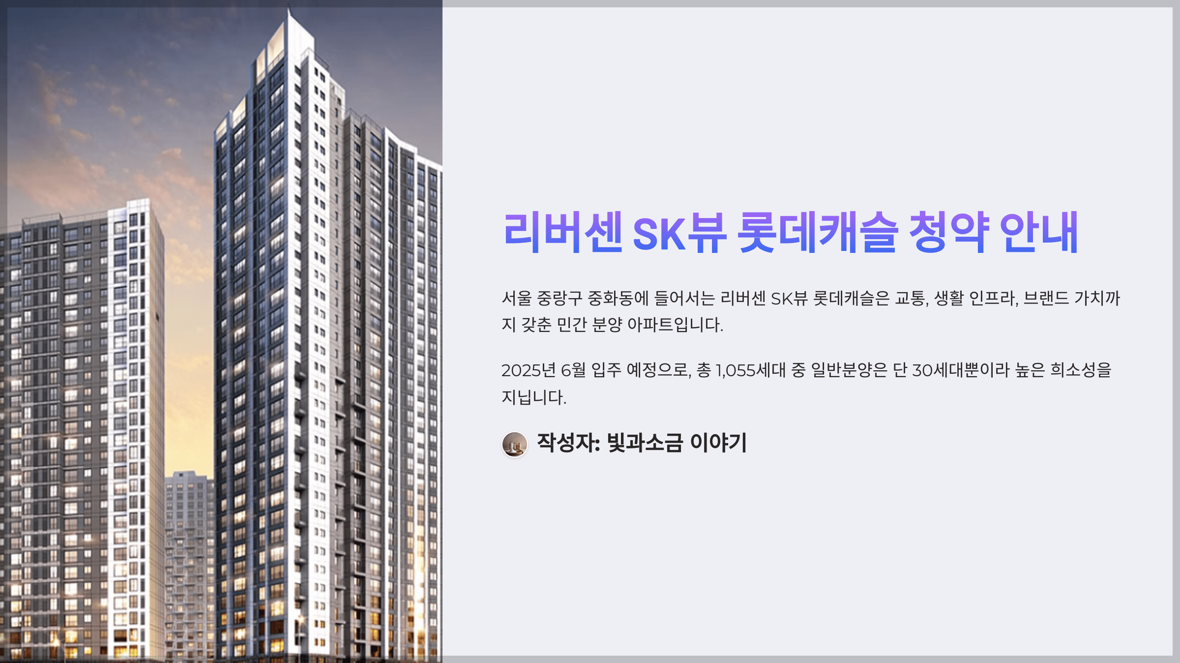 리버센 SK뷰 롯데캐슬 청약, 서울 중랑구 새 아파트 최신정보입니다. 서울 중랑구 중화동에 들어서는 리버센 SK뷰 롯데캐슬은 교통, 생활 인프라, 브랜드 가치까지 고루 갖춘 민간 분양 아파트 입니다.