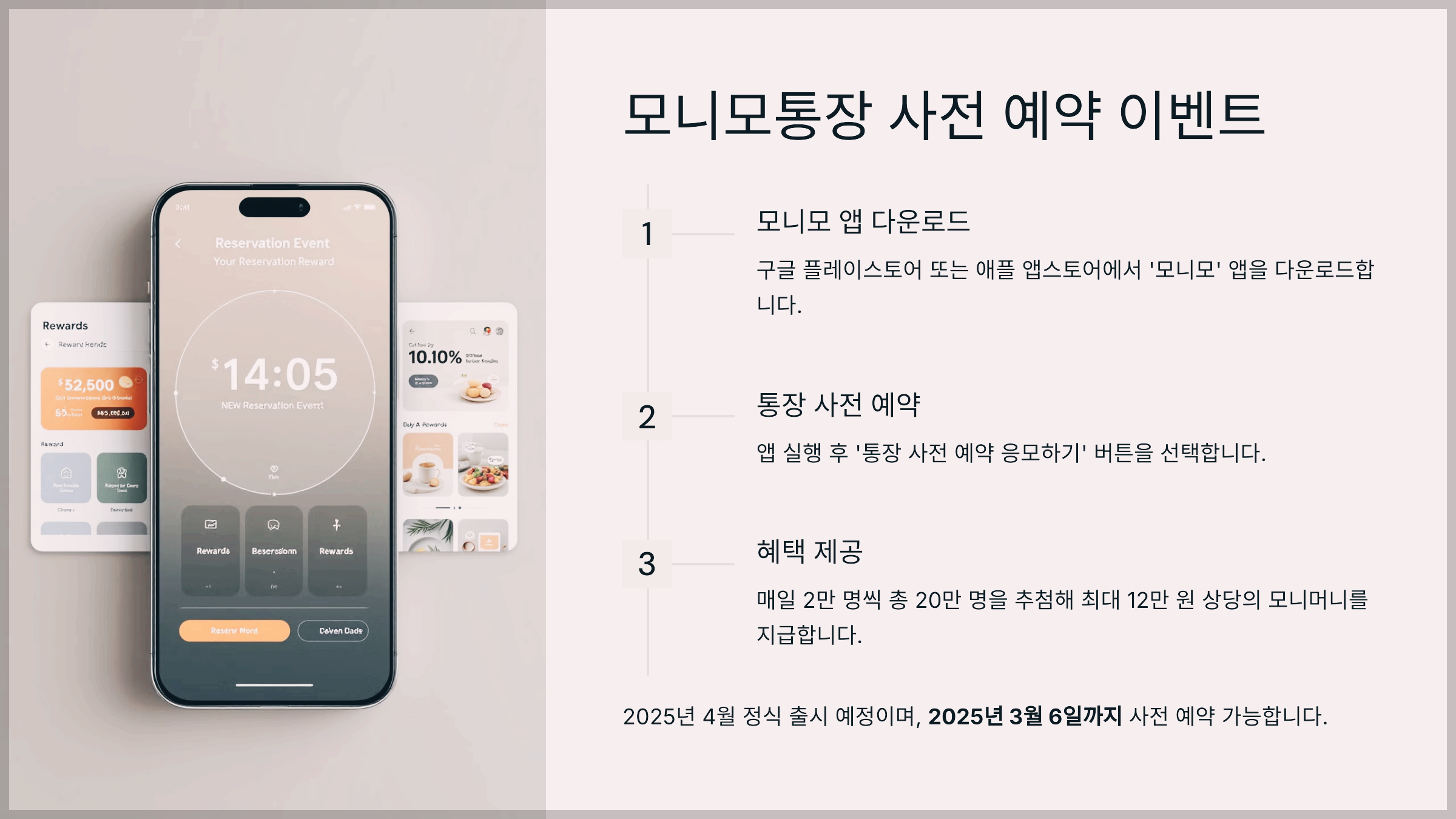 모니모통장은 2025년 4월 정식 출시 예정이며, 현재 사전 예약 이벤트가 진행 중이다. 사전 예약을 하면 추가적인 혜택을 받을 수 있어, 빠르게 신청하는 것이 유리하다.