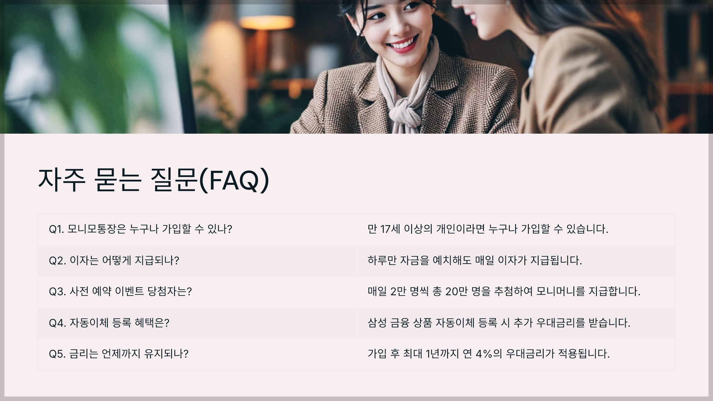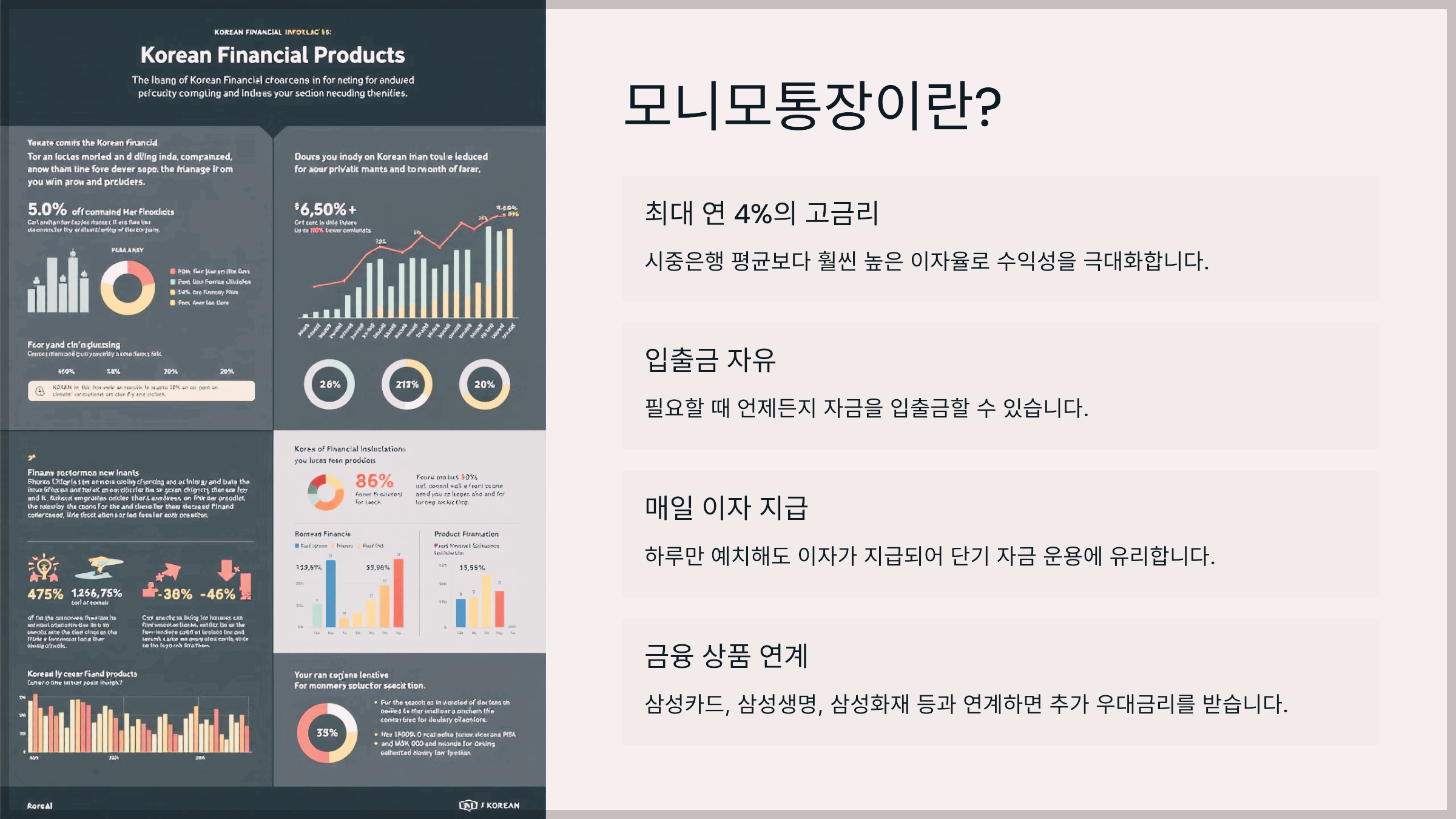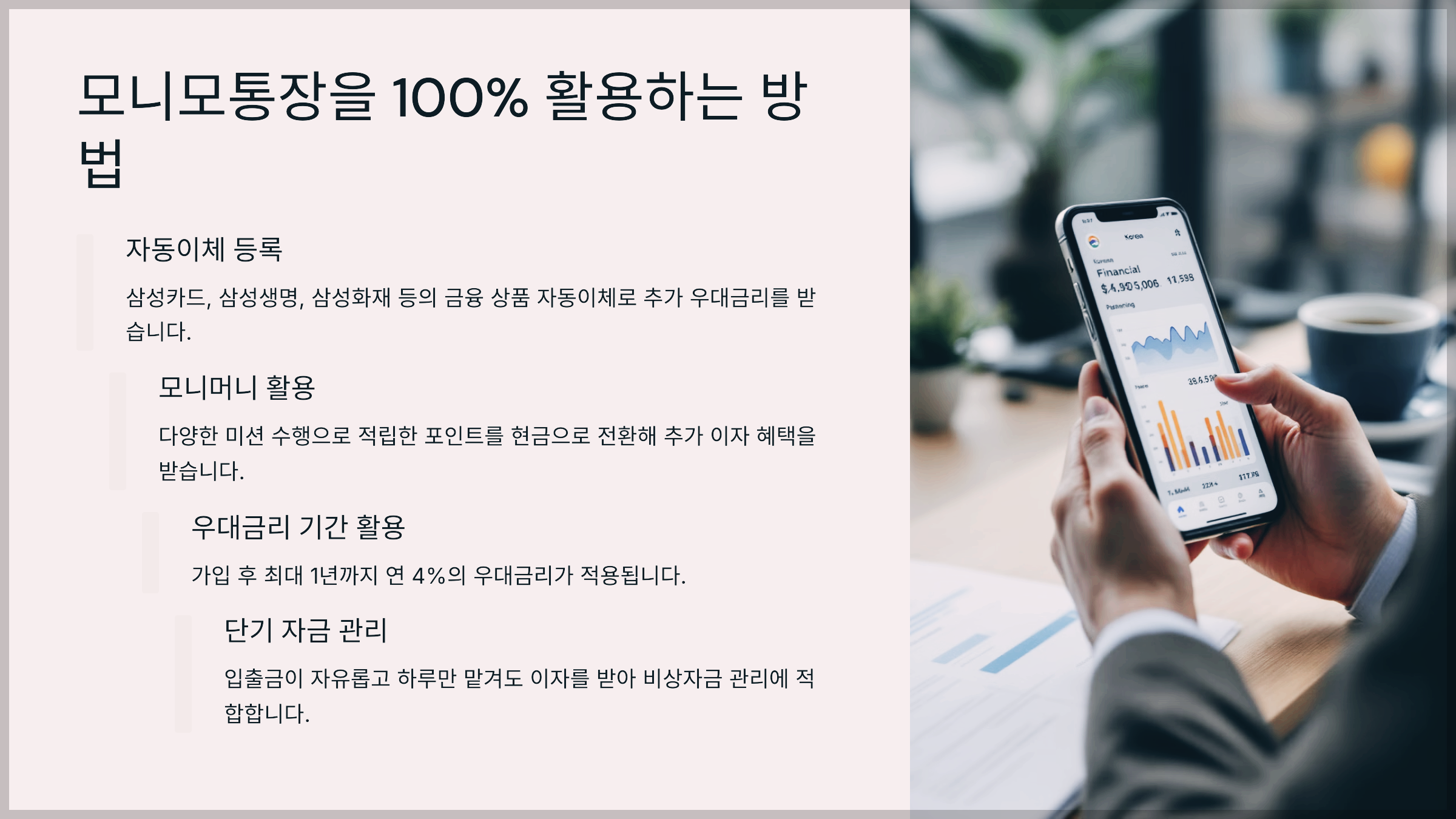 모니모통장은 삼성금융과 KB국민은행이 협력해 만든 수시입출금 통장으로, 기존의 정기예금이나 적금과는 다른 방식으로 높은 이자를 제공한다.