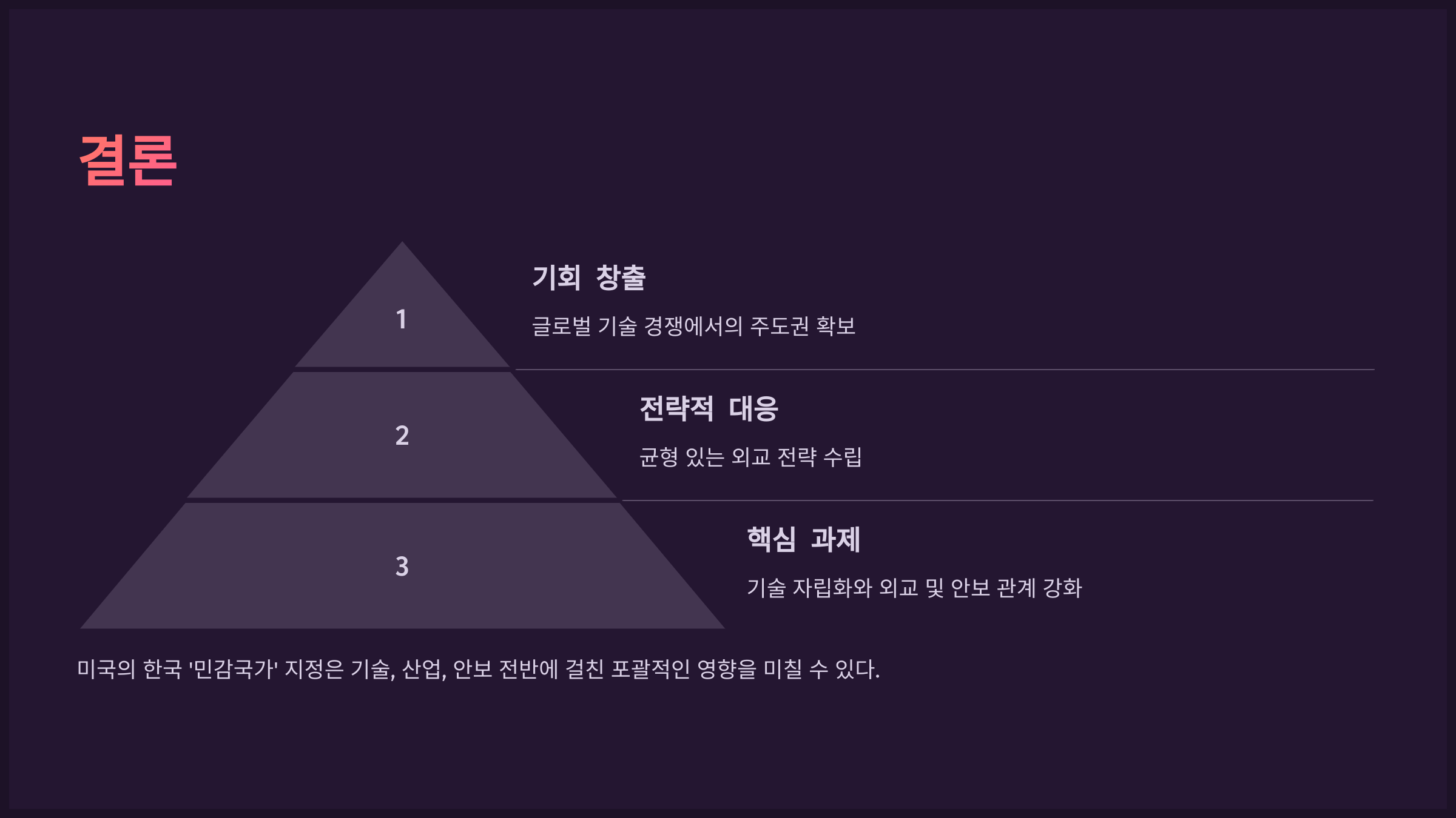 이번 지정이 한국의 외교 및 산업 정책에 상당한 도전 과제가 될 수 있으나, 이를 전략적으로 대응하면 오히려 기회로 전환할 수 있다.