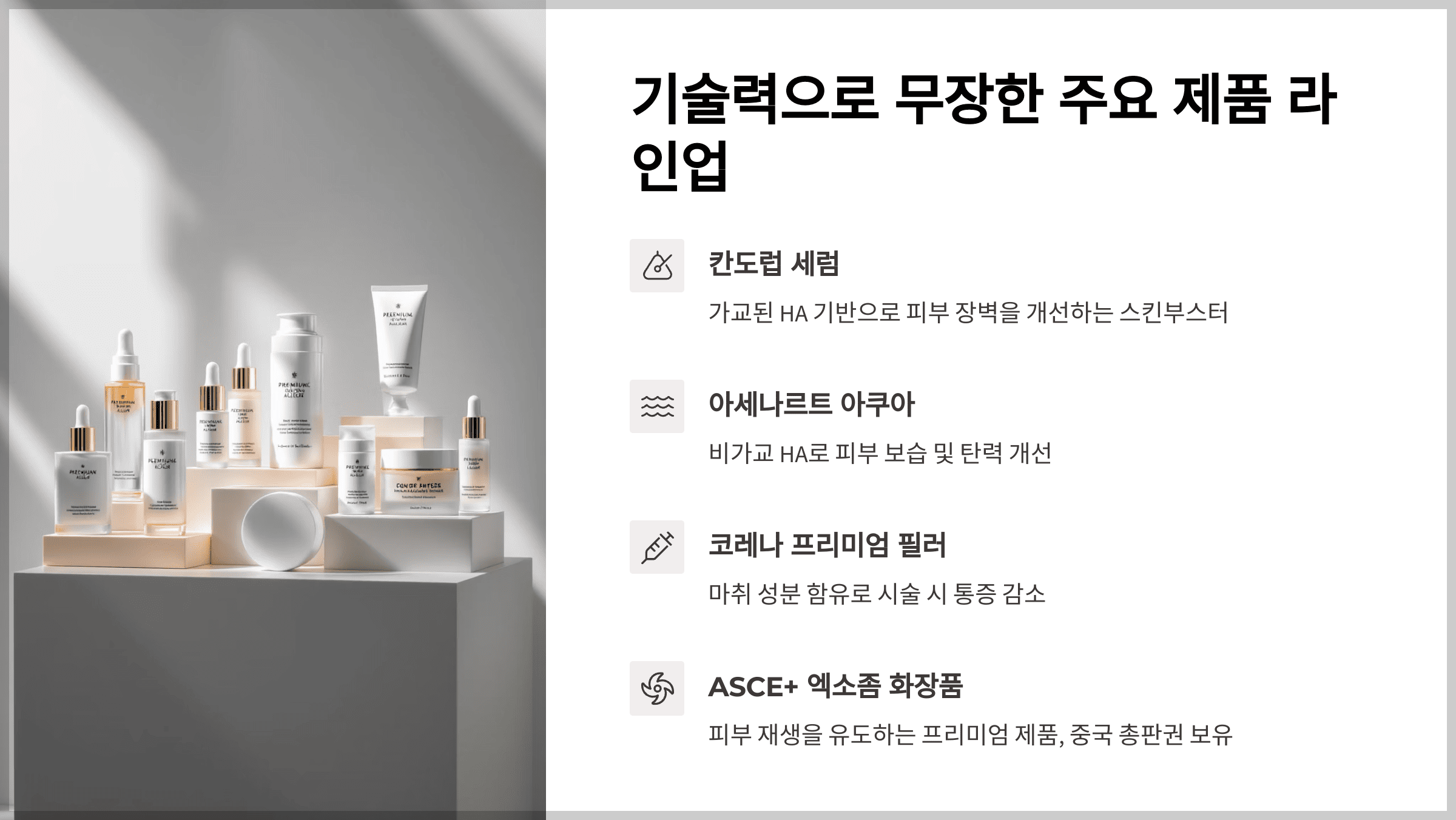 엑소좀 화장품 ‘ASCE+’와 통증 완화형 ‘코레나 프리미엄 필러’가 대표 상품이에요.