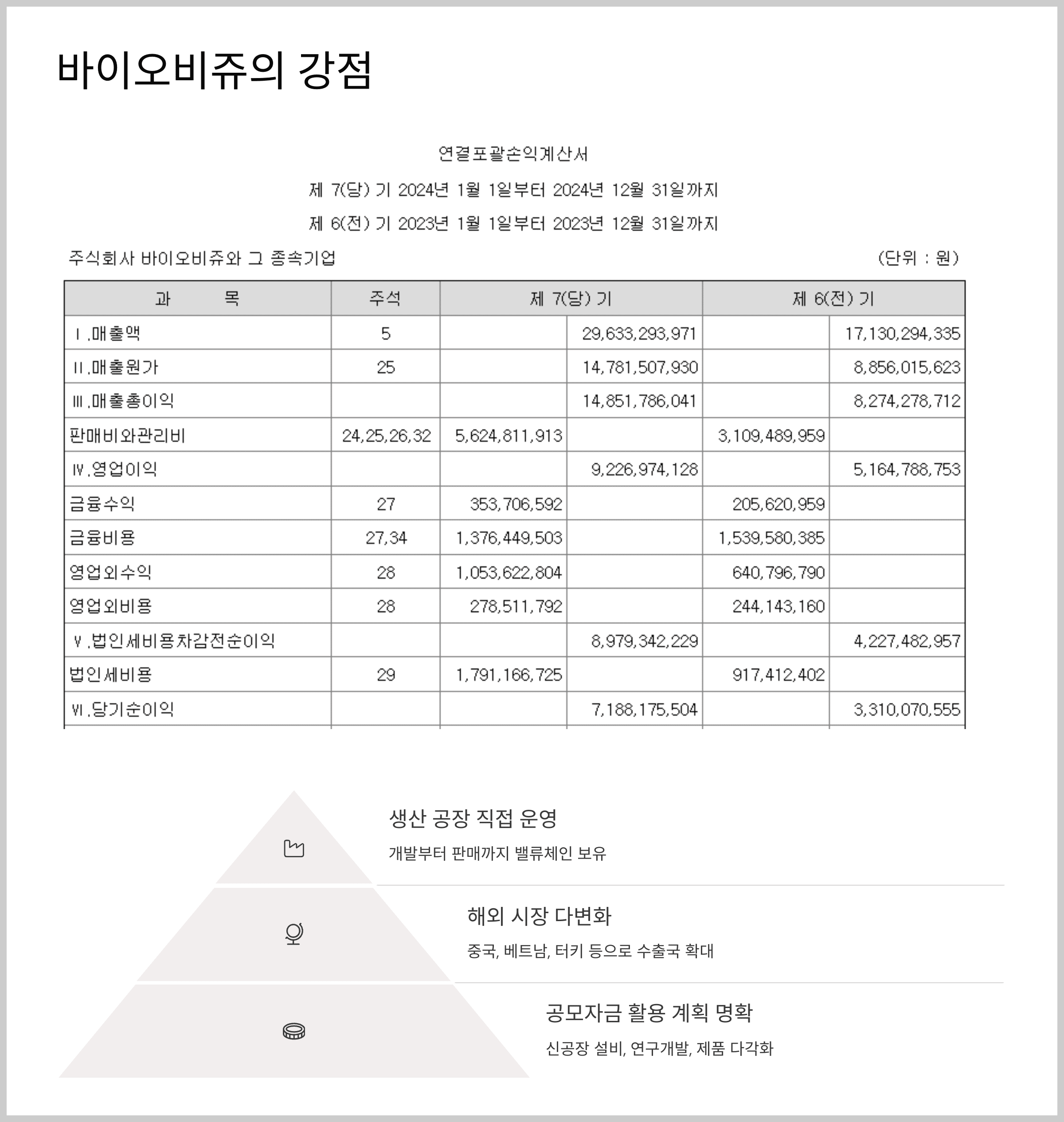 바이오비쥬는 2018년에 설립된 메디컬 에스테틱 전문 기업입니다. 필러, 스킨부스터 등 의료 미용 제품을 자체 개발하고 수출하며, 전체 매출의 약 68%가 해외에서 발생하고 있습니다. 특히 주사 없는 비침습 방식의 제품으로 글로벌 경쟁력을 강화하고 있습니다.