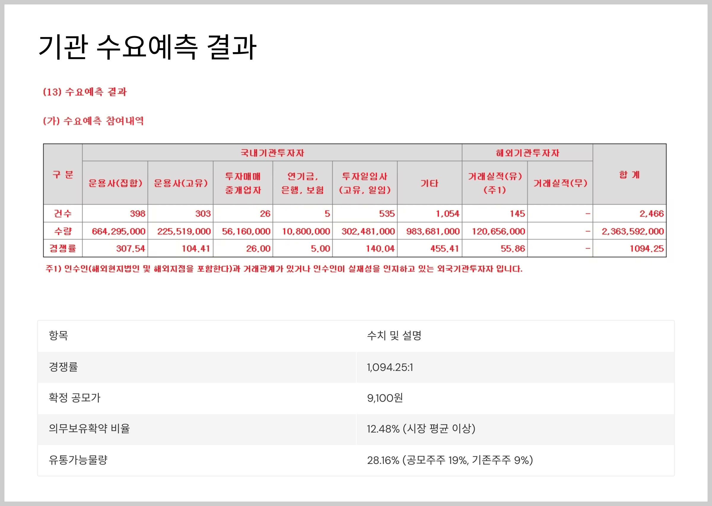 바이오비쥬의 수요예측에는 총 2,466개 기관이 참여했으며, 경쟁률은 1,094.25:1을 기록했습니다. 희망공모가 상단인 9,100원에 거의 모든 기관이 응찰했고, 의무보유확약 비율도 12.48%로 높은 수준입니다.
