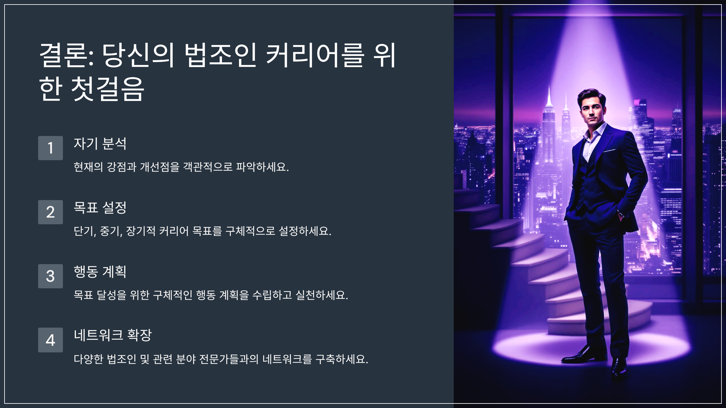 이 글의 내용을 바탕으로 스스로의 커리어 발전 계획을 다시 한 번 점검해보길 권한다. 우선, 역량 진단표를 작성하여 학력, 자격증, 경험 등을 객관적으로 평가한 후, 3년 단위의 구체적인 목표와 마일스톤을 설정해보면 좋다. 또한, 한국법조인협회 경력개발센터와 같은 전문가 컨설팅 서비스를 활용해 정기적인 상담을 받는 방법도 고려해보길 바란다. 📅