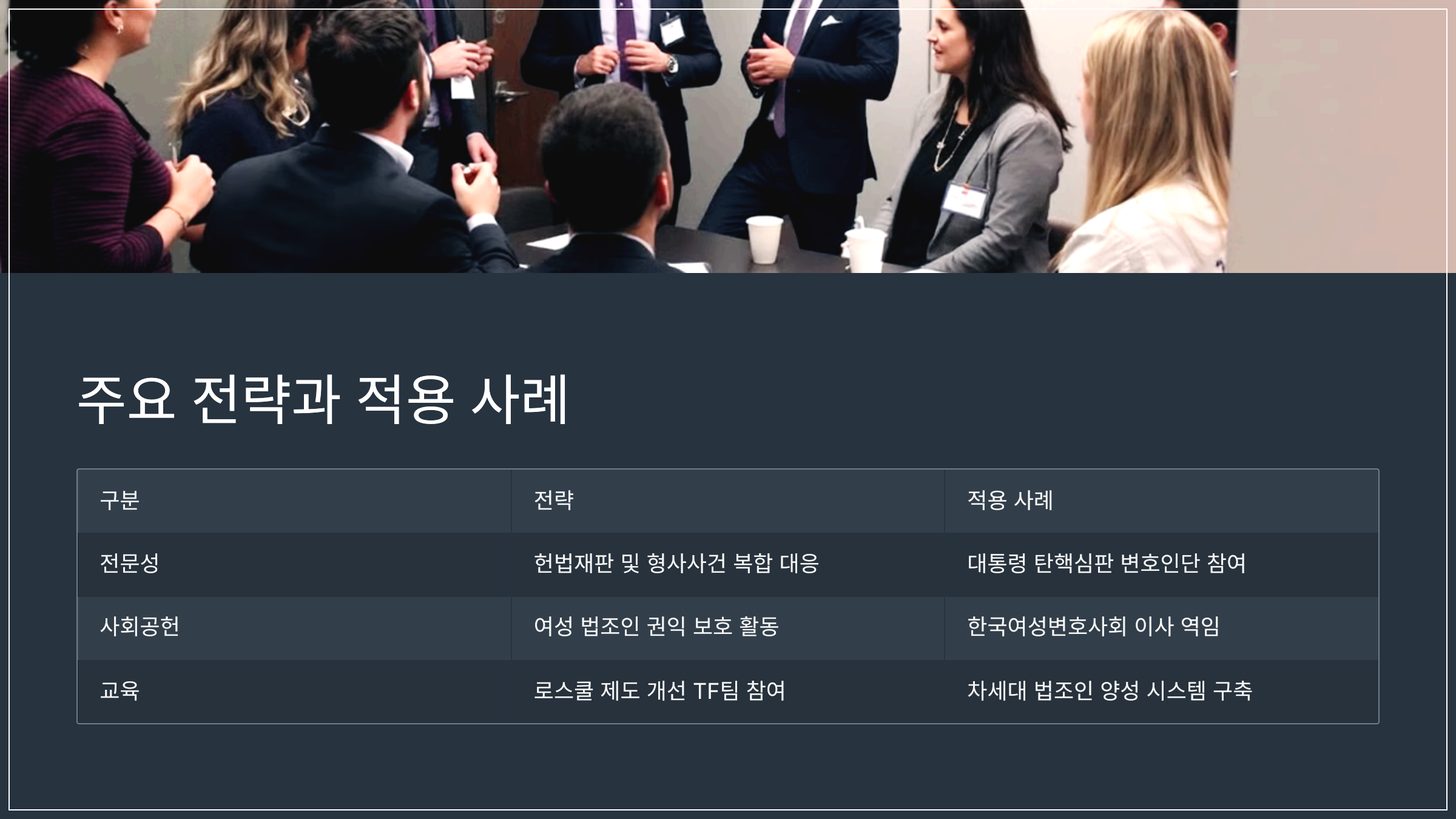 아래의 표에서는 김계리 변호사님의 주요 전략과 구체적인 적용 사례를 정리하였다. 이를 통해 스스로의 경력 발전 전략을 수립할 때 참고할 만한 다양한 요소를 확인할 수 있다. 📊