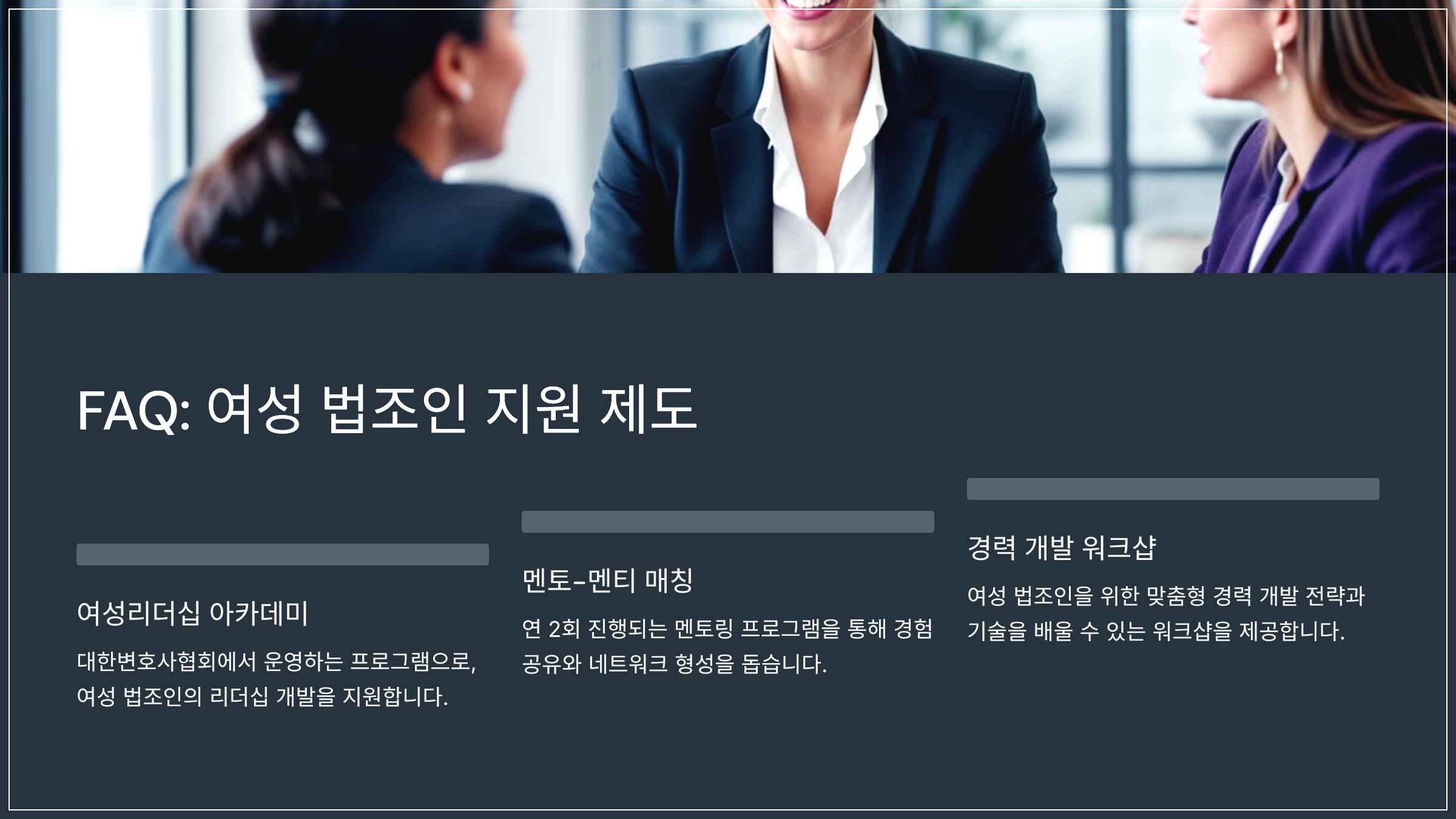 - 대한변호사협회에서 운영하는 ‘여성리더십 아카데미’에서는 멘토-멘티 매칭 프로그램을 연 2회 진행하고 있으므로, 관련 정보를 확인하고 필요 시 참여하는 것도 좋은 선택이다. 👩⚖️