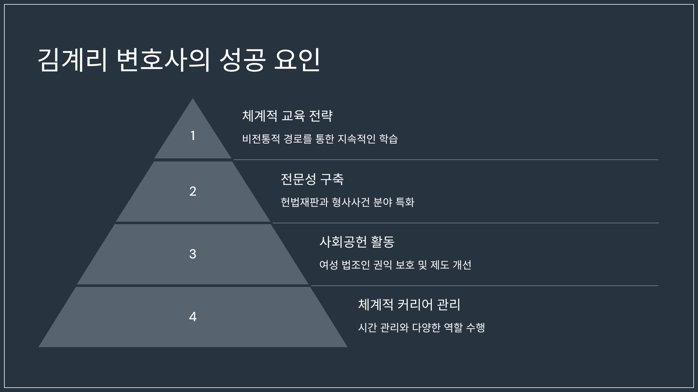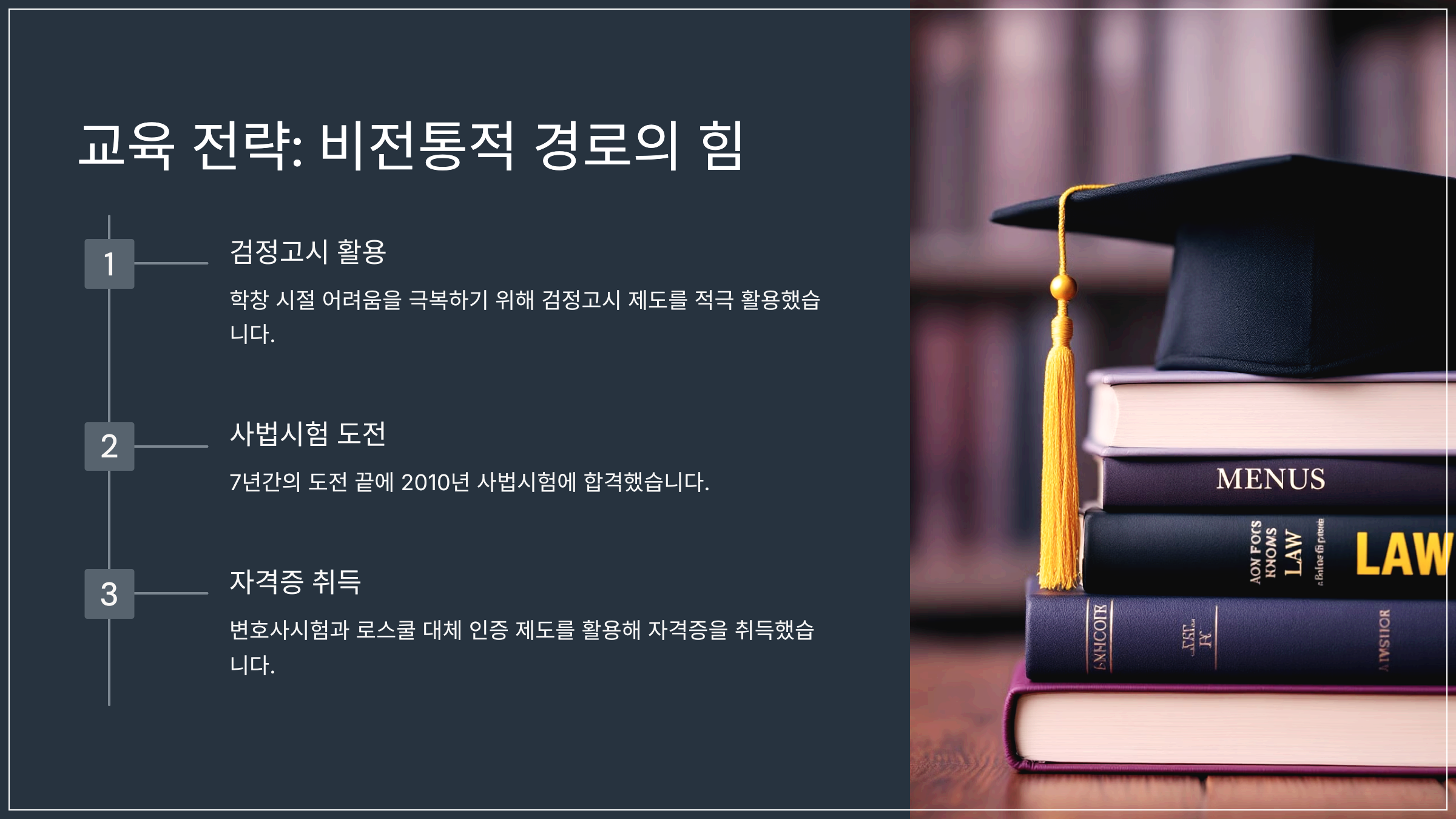검정고시라는 비전통적인 경로를 오히려 강점으로 전환한 점이 주목할 만하다. 사법시험 외에도 변호사시험과 로스쿨 대체 인증 제도를 활용해 자격증 취득에 매진한 사례를 통해, 공식 교육 경로에만 의존하지 않고 자기 계발에 힘쓰는 방법을 고민해볼 필요가 있다. 이처럼 김계리 변호사님의 교육 전략은 스스로의 잠재력을 믿고 도전하는 자세의 중요성을 일깨워준다. 🚀
