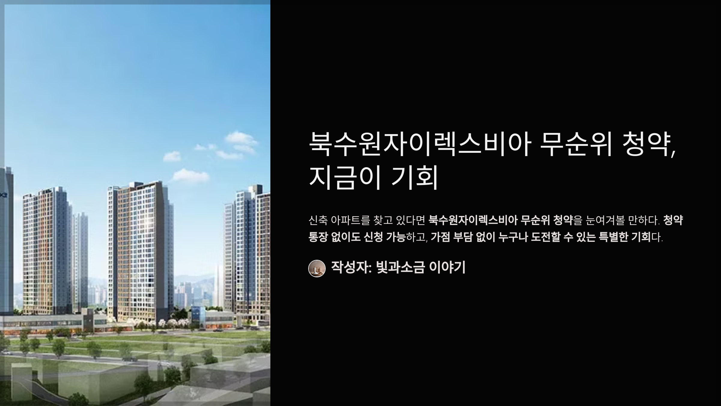 북수원자이렉스비아 무순위 청약, 지금이 기회입니다. 신축 아파트를 찾고 있다면 북수원자이렉스비아 무순위 청약을 눈여겨볼 만하다. 청약통장 없이도 신청 가능하고, 가점 부담 없이 누구나 도전할 수 있는 특별한 기회다. 입지, 청약 일정, 투자 가치까지 꼼꼼히 분석해 보자.