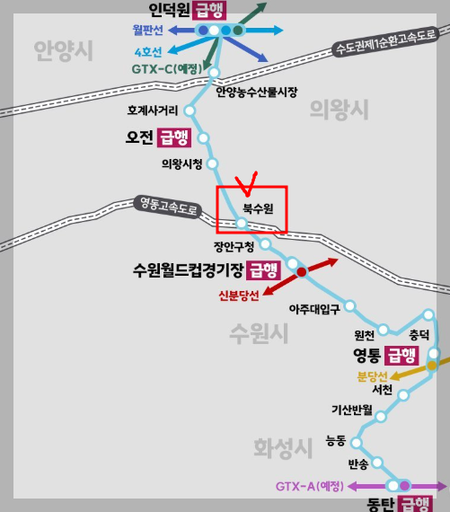 교통편으로 1호선 성균관대역, 인덕원동탄서 북수원역(예정)