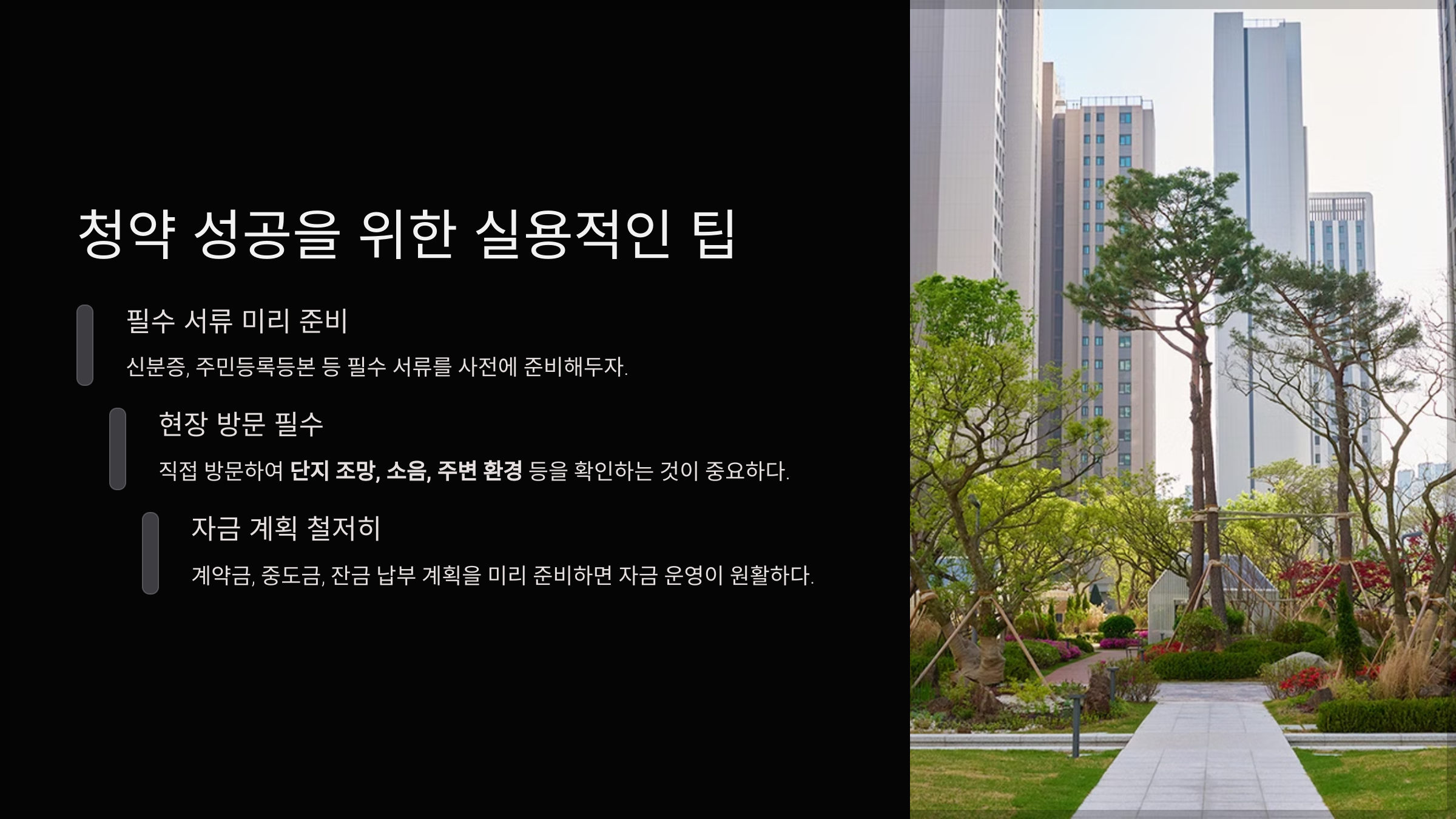 - 계약금, 중도금, 잔금 납부 계획을 미리 준비하면 자금 운영이 원활하다.