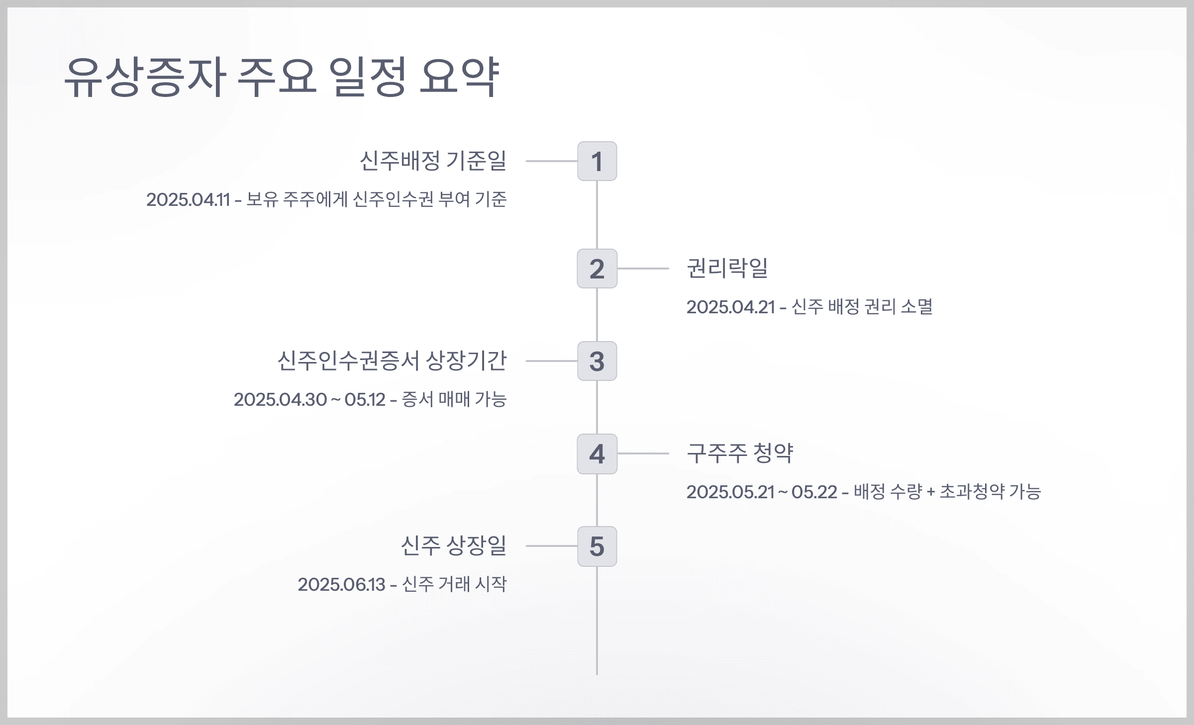 | 신주배정 기준일 | 2025.04.11 | 보유 주주에게 신주인수권 부여 기준 |