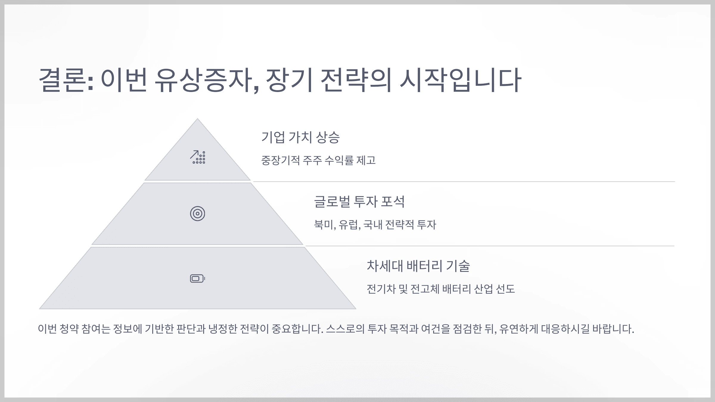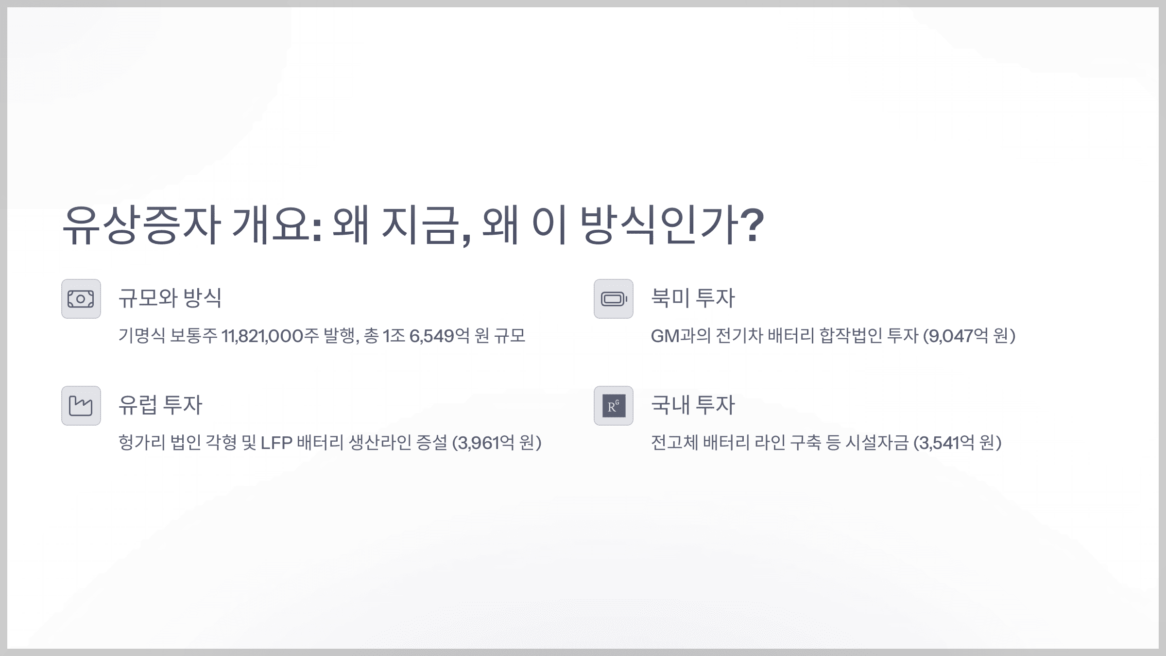 이번 유상증자는 단순한 자본 확충이 아니라 북미·유럽 지역 배터리 생산능력 강화와 전고체 배터리 기술 확보라는 중장기 성장 전략을 위한 기반입니다.