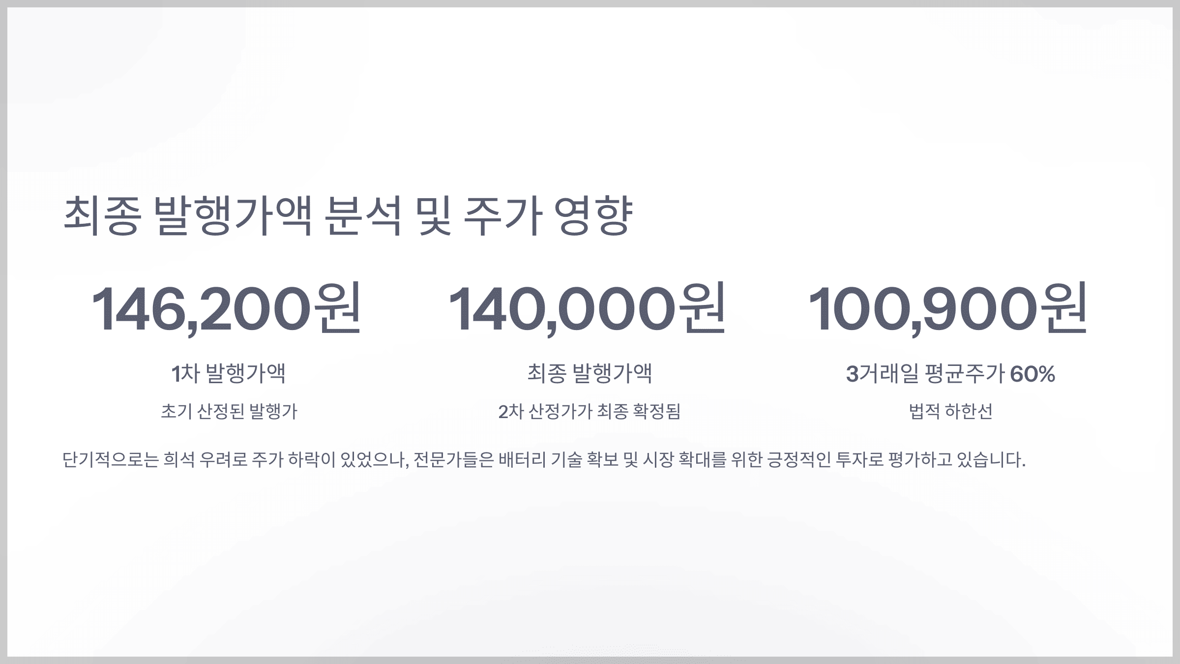 💬 단기적으로는 희석 우려로 주가 하락이 있었으나, 전문가들은 배터리 기술 확보 및 시장 확대를 위한 긍정적인 투자로 평가하고 있습니다.