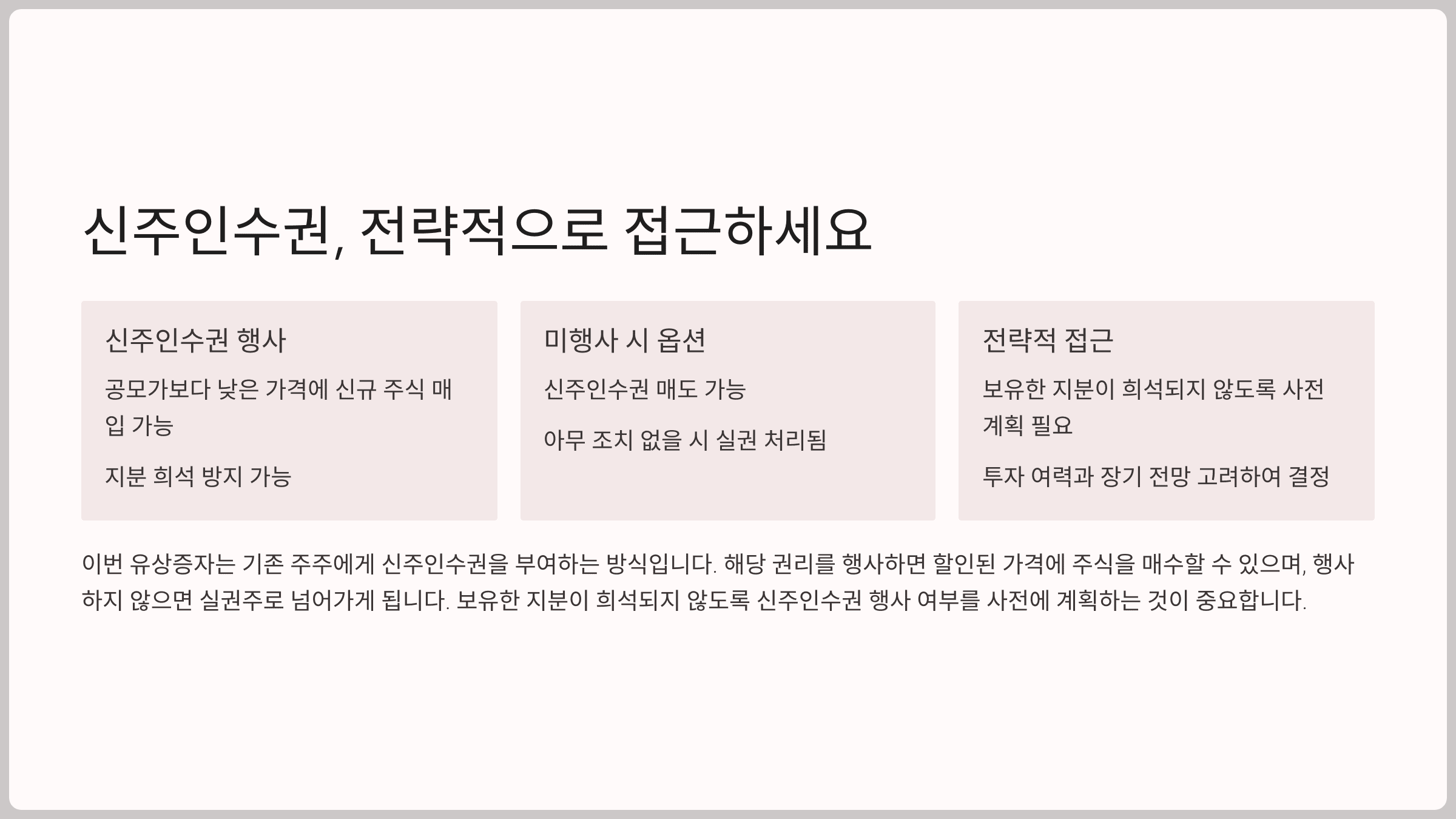 📌 보유한 지분이 희석되지 않도록 신주인수권 행사 여부를 사전에 계획하는 것이 중요합니다.