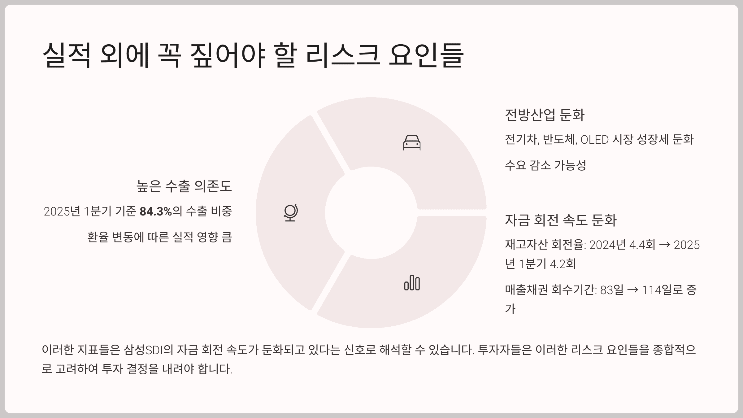 삼성SDI의 수출 비중은 2025년 1분기 기준 84.3%에 달합니다. 환율 변동에 따라 실적에 직접적인 영향을 받는 구조입니다. 또한 전방 산업인 전기차, 반도체, OLED 시장의 둔화도 부담으로 작용하고 있어요.