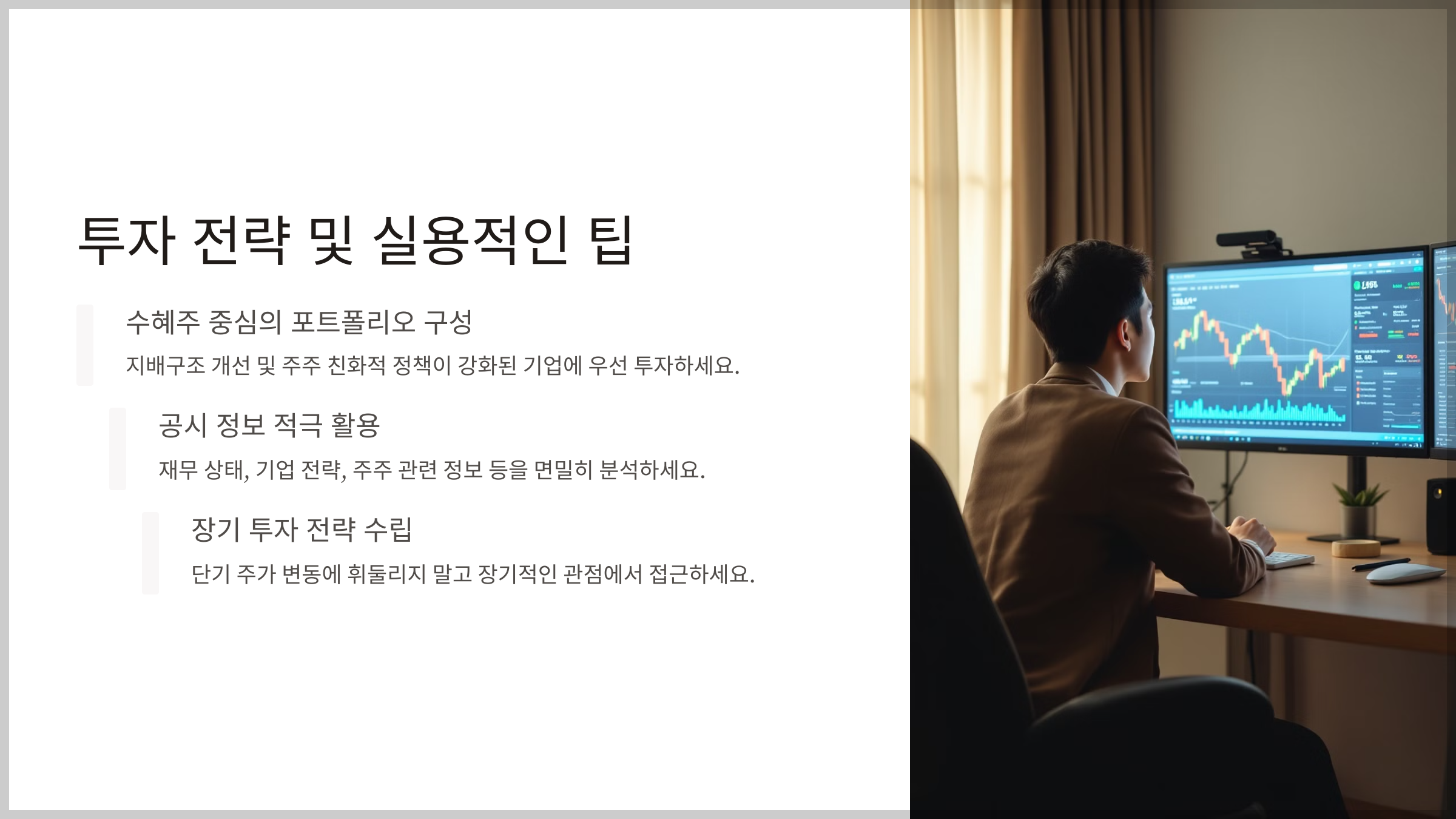 지금 바로 상법 개정 수혜주를 분석하고, 전략적인 투자를 시작해 보자. 이번 기회를 잘 활용하면 장기적인 투자 성과를 기대할 수 있다.