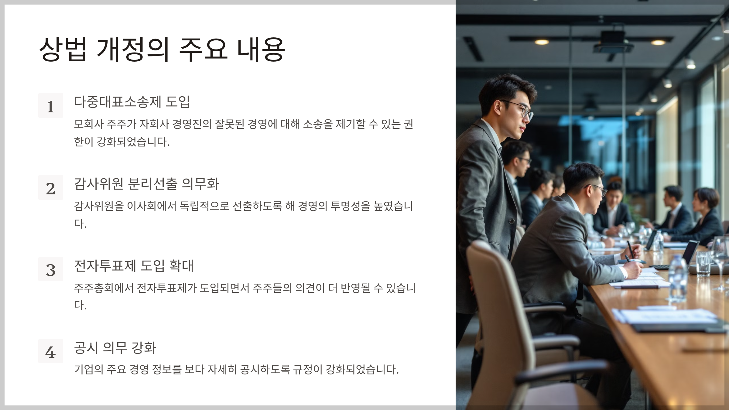 상법 개정은 기업의 투명성과 책임 경영을 강화하는 데 초점이 맞춰져 있다. 주요 내용은 다음과 같다.