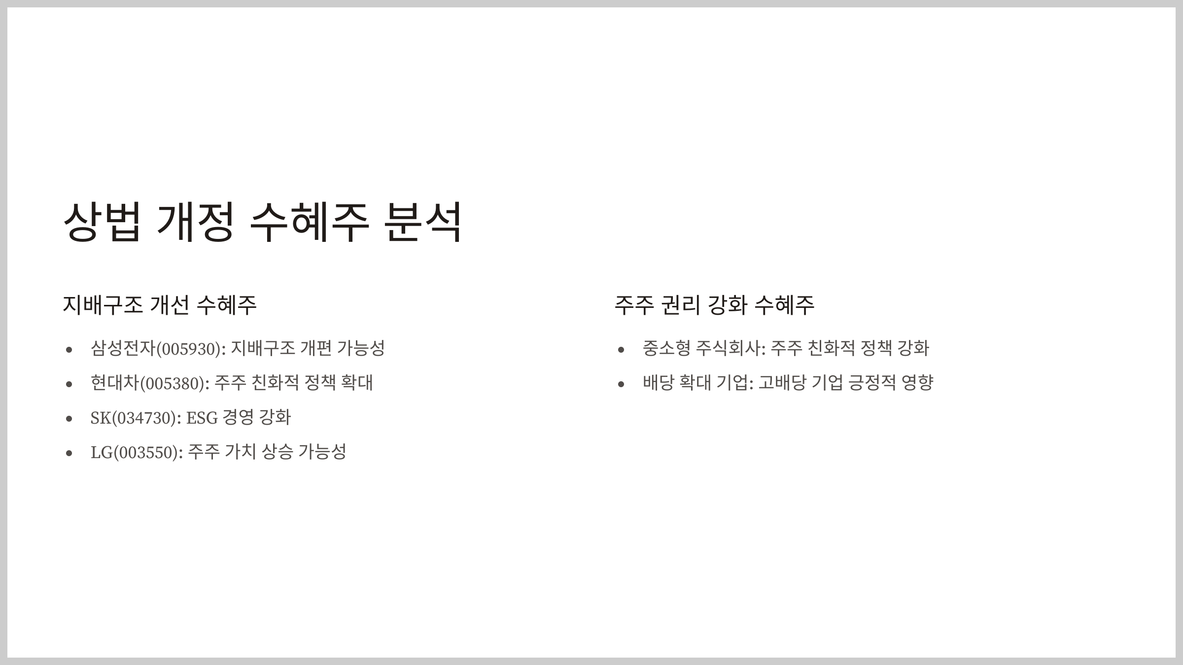 특히 경영 투명성을 높이고 주주 친화적 정책을 강화하는 방향으로 이루어진 만큼, 특정 업종과 기업들이 직접적인 수혜를 받을 가능성이 크다.