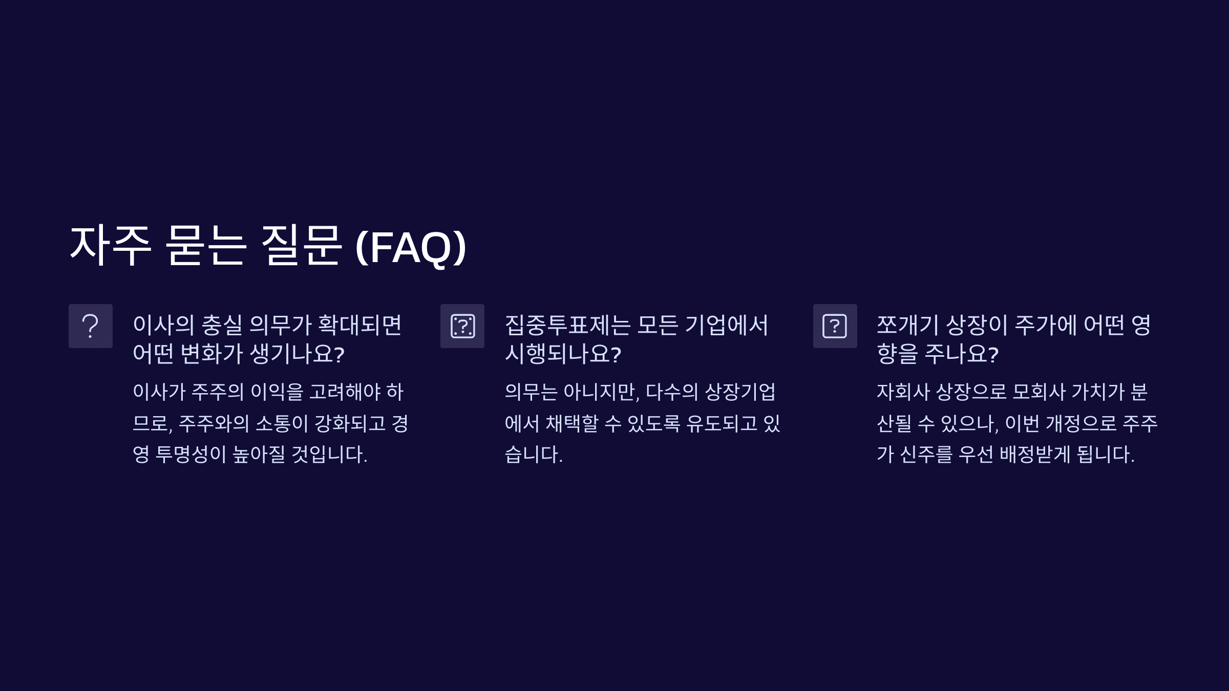 지금까지 상법 개정안, 이사 책임, 집중투표제, 쪼개기 상장에 대해 살펴봤습니다.
