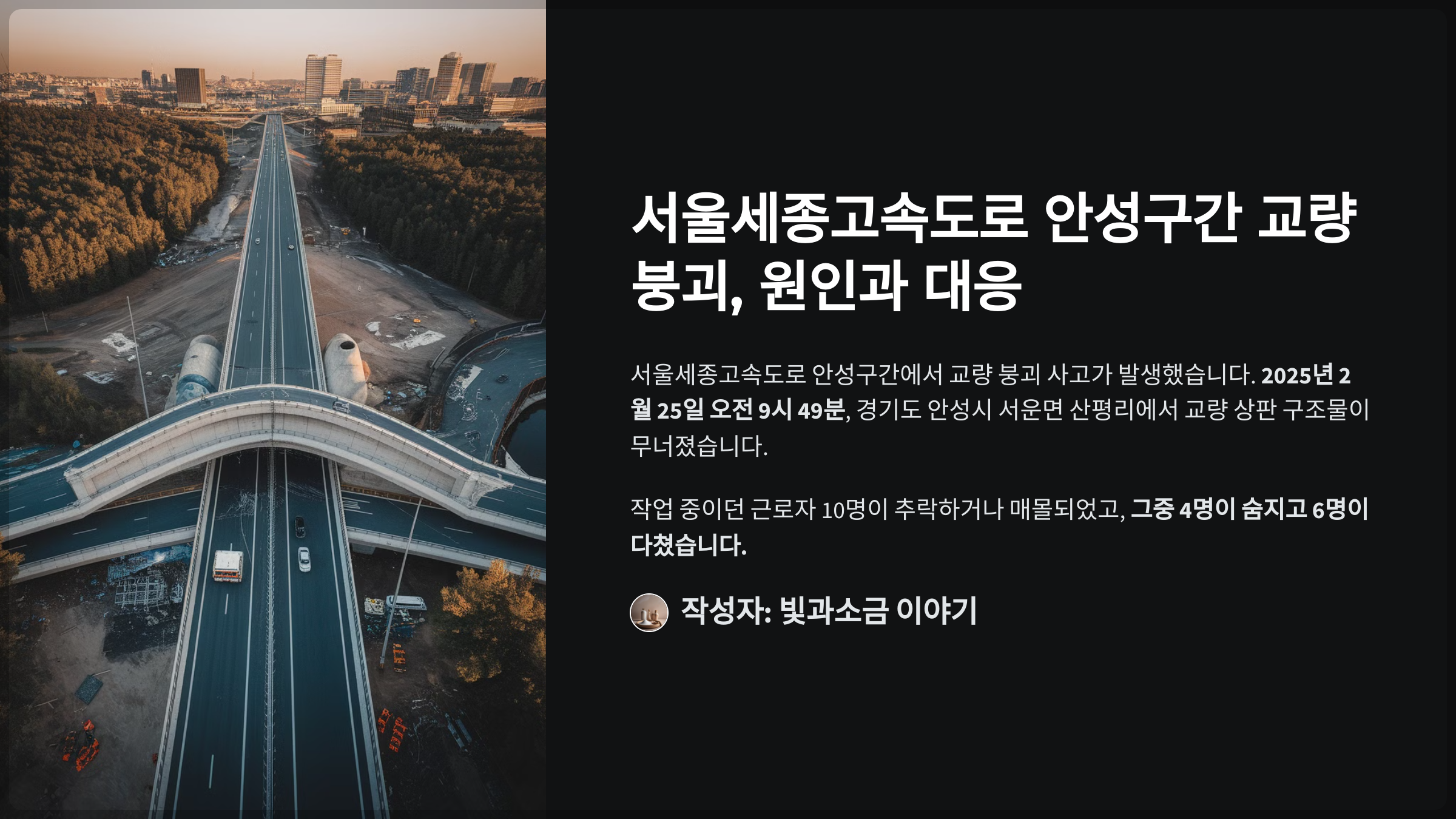 사고는 2025년 2월 25일 오전 9시 49분, 경기도 안성시 서운면 산평리에서 발생했습니다. 서울세종고속도로 천안-안성 구간에서 교량 상판 구조물이 무너져 내리면서 작업 중이던 근로자 10명이 추락하거나 매몰되었고, 그중 4명이 숨지고 6명이 다쳤습니다.